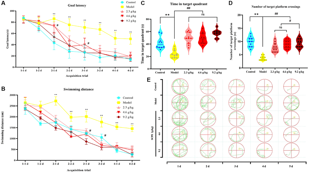 In the first part of the acquisition trial, the target latency and total swimming distance did not differ between the groups, suggesting that CI model (SAMP8) mice had normal visual and motor functions similar to those of the control group (SAMR1); thus, the animals were used in subsequent studies. The learning curve generated from the 4-day acquisition test showed spatial learning and memory impairments in CI model mice. In other words, the curve of control mice was steeper, indicating faster task acquisition, while the curve of CI model mice was shallower, indicating difficulty in task acquisition. The learning curves of the groups treated with the 3 doses of SCPE were the same as those of the normal control group, indicating that the drug improved the impaired cognitive function of CI model mice. The results of the statistical analysis are summarized below.