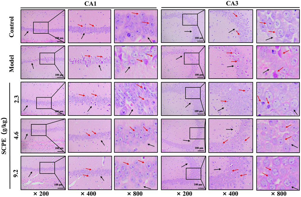 Conventional slices of mouse hippocampal tissues were stained with HE and viewed at high (×800, ×400) and low (×200) magnification (Figure 8). In the control group, the morphology and structure of neurons in the hippocampal CA1-CA3 area were normal, the cell bands were tightly arranged, and the number of neuron layers was greater. The number of pyramidal cells was greater than that in the other groups. The nuclei were large and round, the nucleoli were clear, the staining was shallow, the cytoplasm was rich, the staining was uniform, no obvious abnormal pathological changes, such as cell lysis or nuclear pyknosis, were observed, the nuclear membrane was clear, and a few normal glial cells were observed. In the model group, the numbers of normal neurons in both the CA1 and CA3 areas were obviously decreased, and abnormal pathological manifestations, such as cell necrosis and degeneration, were significant. The pyramidal cells were irregular in shape, decreased in volume, and scattered in arrangement, and showed obvious nuclear pyknosis and glial proliferation. These pathological changes were improved in the 2.3 g/kg SCPE-treated group compared with the model group, but to a lesser extent. The pathological changes in both the hippocampal CA1 and CA3 regions were significantly improved in the 4.6 g/kg and 9.2 g/kg SCPE-treated groups compared with those in the model group. The number of neurons was significantly increased, the cells were arranged relatively neatly and tightly, and the number of degenerating cells was significantly reduced. The number of pyramidal cells increased significantly, the degree of nuclear pyknosis was reduced, the nuclear membrane was clear, and a few normal glial cells were observed.