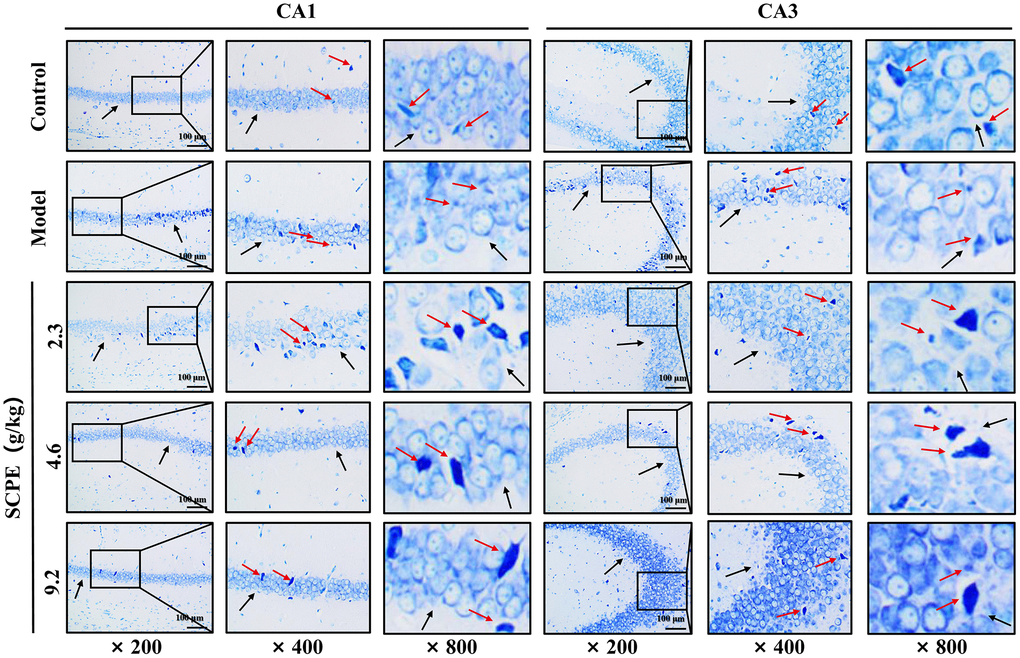 Nissl bodies in the hippocampal CA1 and CA3 regions were observed under a microscope (Figure 9). The number and content of Nissl bodies were abundant in the control group. In the model group, Nissl bodies were granular or disintegrated, disappeared and were small and scattered. Compared with the model group, the number and volume of Nissl bodies increased in the 3 SCPE-treated groups. These results suggested that SCPE improved the metabolic level of neurons in the hippocampus of CI mice.