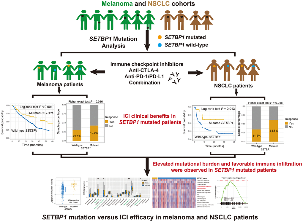 Cancer immunotherapy is commonly used for two cancer types of melanoma and NSCLC. In this integrated study, we collected genomic mutational data and clinical immune treatment information for both tumor types and performed multi-dimensional immunological analyses. Our findings suggest that SETBP1 mutations could be a promising biomarker in clinical cancer immunotherapies.