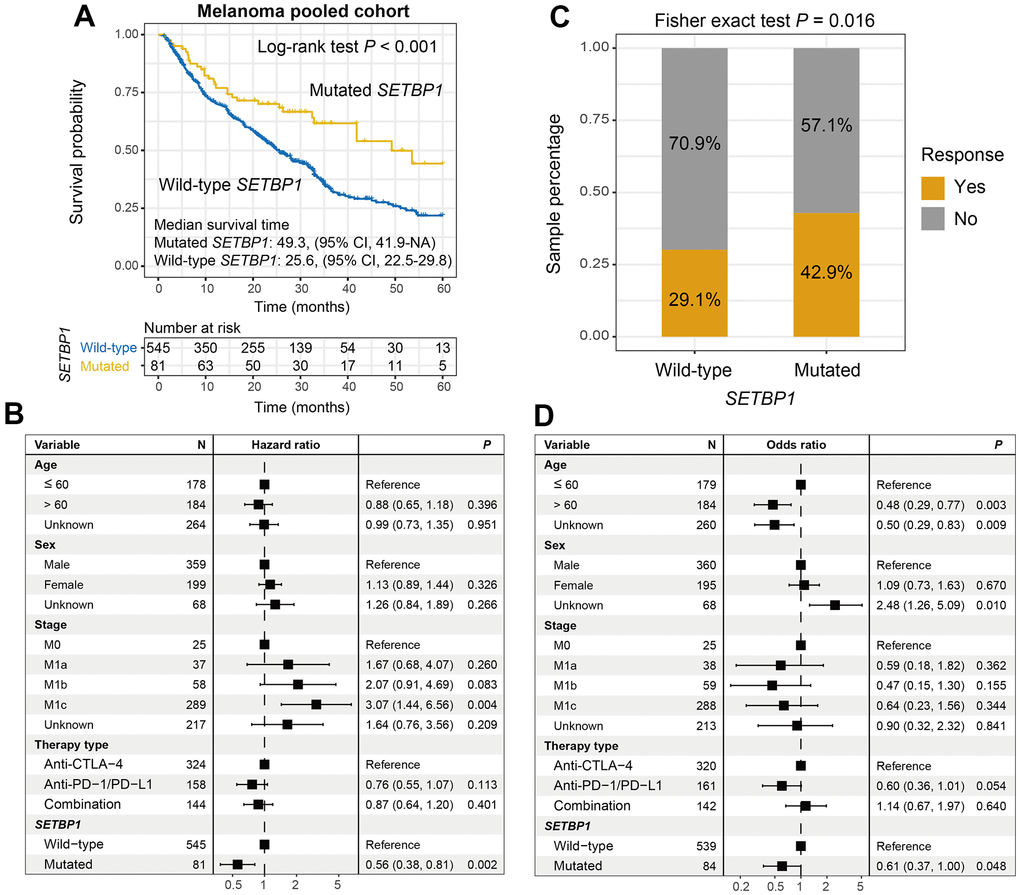 We first explored the ICI prognostic roles of SETBP1 mutations in pooled melanoma patients. Kaplan-Meier results showed that SETBP1 mutated (SETBP1-MUT) melanoma patients exhibited a markedly improved ICI survival benefit than wild-type patients (median survival time: 49.3 vs. 25.6 months, Log-rank test P < 0.001; Figure 2A). A multivariate Cox regression model of SETBP1 mutations was conducted with several clinical factors adjusted; and the association was still significant (HR = 0.56, P = 0.002; Figure 2B). We also investigated the ICI prognostic roles of SETBP1 mutations in each melanoma cohort and the distinct therapeutic types used in this study (Supplementary Figures 3, 4, respectively). Further analyses revealed that a significant immunotherapeutic response advantage was found in the SETBP1-MUT subgroup (42.9% vs. 29.1%, Fisher exact test P = 0.016; Figure 2C). A multivariate logistic adjusted analysis consistently confirmed this result (OR = 0.61, P = 0.048; Figure 2D).