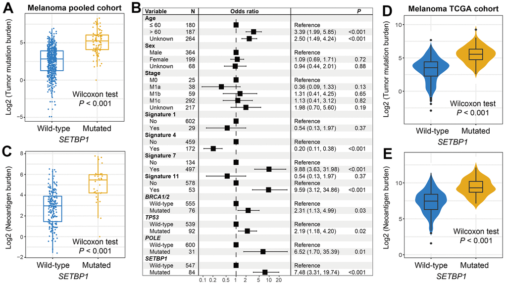 Tumor mutational burden (TMB) is recently reported as a hopeful indicator for cancer immunotherapies and its level is linked with tumor immunogenicity. We thus analyzed the connection of SETBP1 mutations with TMB in melanoma. Results showed that SETBP1-MUT patients harbored a significantly increased TMB than other patients (Wilcoxon rank-sum test P < 0.001; Figure 3A). Taking into account that tumor mutational signatures are deeply associated with the genomic mutational burden. We therefore extracted a total of 4 mutational signatures from melanoma mutational profiles (Supplementary Table 1). Subsequently, in a multivariate-adjusted model, we incorporated clinical confounders, identified mutational signatures, and genome maintenance gene alterations to elucidate the actual link between SETBP1 mutations and higher TMB. Consistently, the result was still significant (OR: 7.48, P < 0.001; Figure 3B). Moreover, an increased neoantigen burden (NB) was also enriched in the SETBP1-MUT group (Wilcoxon rank-sum test P < 0.001; Figure 3C). To further validate the above connections, we employed genomic and clinical data of melanoma samples from the Cancer Genome Atlas (TCGA). Expectantly, the significantly increased TMB and NB were both observed in the SETBP1-MUT patients (both P < 0.001; Figure 3D, 3E).