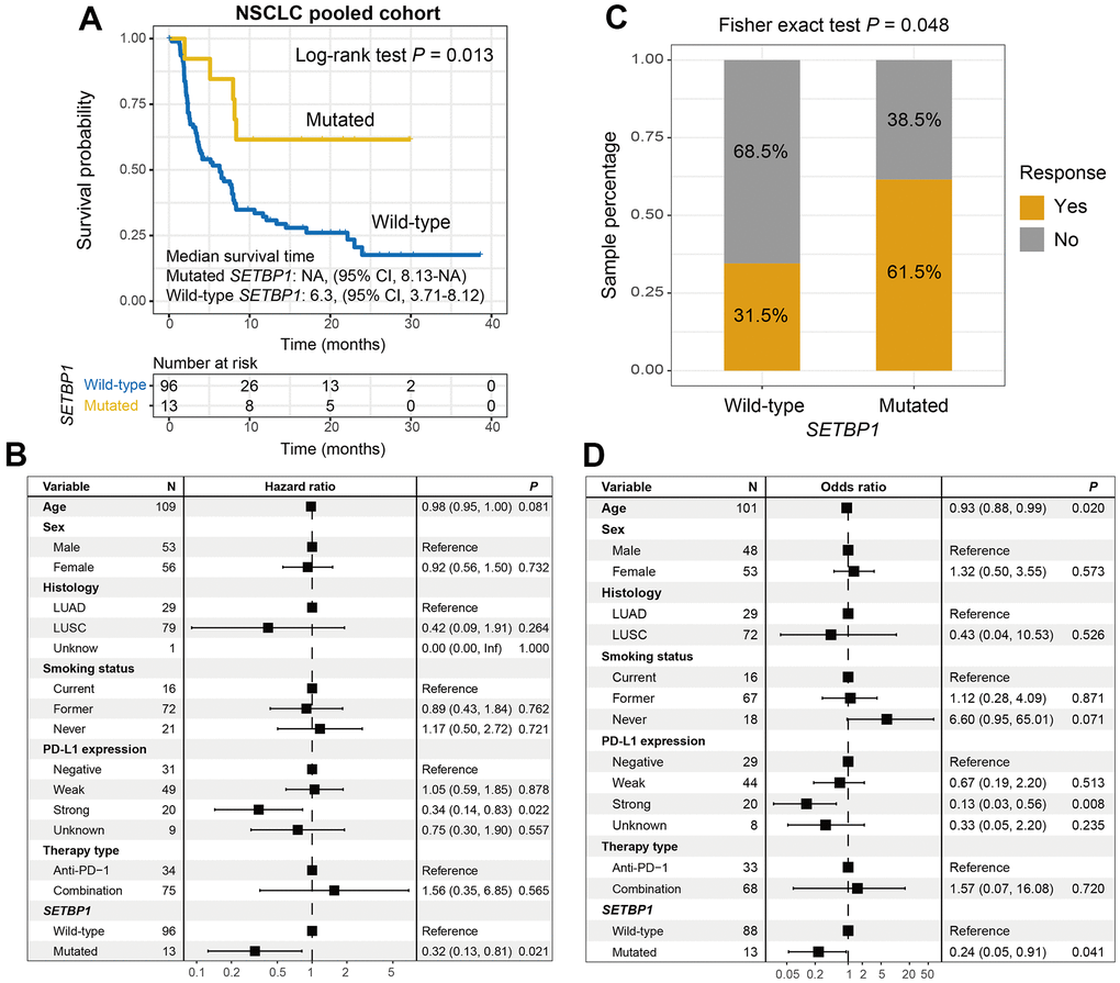 Among the aggregated NSCLC samples, a total of 13 (11.9%) of 109 had SETBP1 mutations. Kaplan-Meier results demonstrated that SETBP1-MUT NSCLC patients presented a markedly improved ICI survival benefit than wild-type patients (median survival time: NA vs. 6.3 months, Log-rank test P = 0.013; Figure 4A). A multivariate Cox regression analysis of SETBP1 mutations was conducted with multiple clinical factors adjusted; and the connection still reached the statistical significance (HR = 0.32, P = 0.021; Figure 4B). We also explored the ICI prognostic roles of SETBP1 mutations in each NSCLC cohort and the distinct therapeutic types utilized in this study (Supplementary Figure 5). Further calculation indicated that an immunotherapeutic response advantage was noticed in such SETBP1-MUT group (61.5% vs. 31.5%, Fisher exact test P = 0.048; Figure 4C). A multivariate logistic adjusted analysis consistently validated this association (OR = 0.24, P = 0.041; Figure 4D).