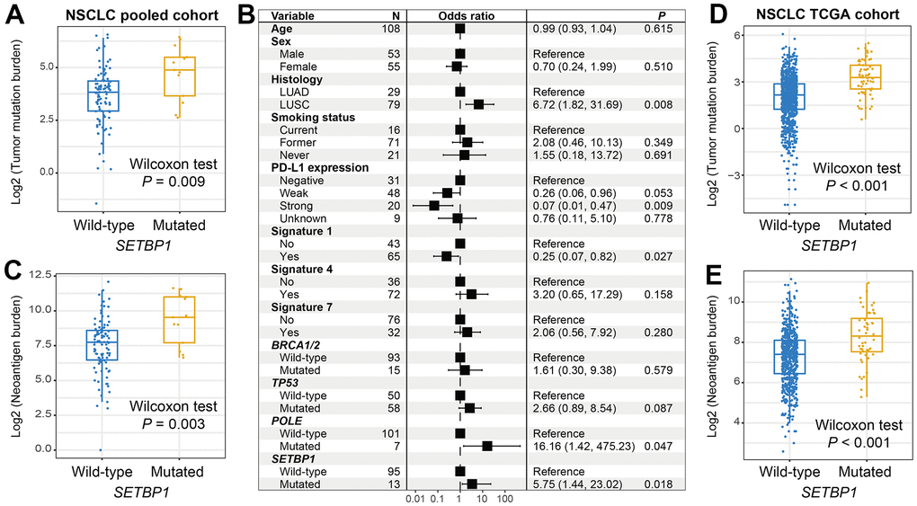 Genomic mutational burden analysis showed that SETBP1-MUT NSCLC patients harbored a significantly increased TMB (Wilcoxon rank-sum test P = 0.009; Figure 5A). A total of 3 mutational signatures were determined from NSCLC mutational profiles (Supplementary Table 2). In a multivariate-adjusted analysis, we incorporated clinical confounders, identified mutational signatures, and genome maintenance gene mutations to investigate the actual connection between SETBP1 mutations and elevated TMB. Consistently, the connection was still meaningful (OR: 5.75, P = 0.018; Figure 5B). Furthermore, an increased NB was also noticed in this SETBP1-MUT subgroup (Wilcoxon rank-sum test P = 0.003; Figure 5C). Based on the genomic and clinical data of NSCLC samples from the TCGA, SETBP1-MUT patients also exhibited significantly enhanced TMB and NB (both P < 0.001; Figure 5D, 5E).