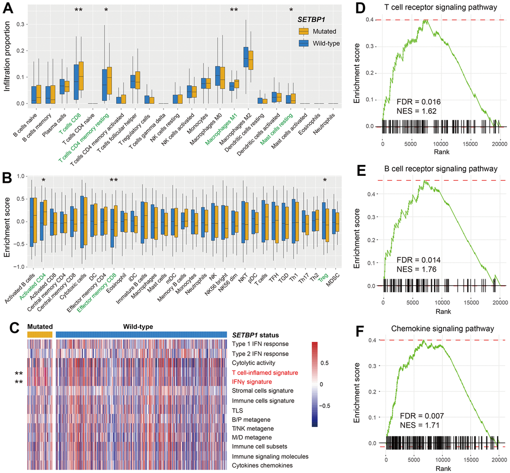 The aforementioned results have indicated that SETBP1 mutations determined the ICI treatment efficacy. Therefore, we further explored the potential immunological properties of SETBP1 mutations. In melanoma, based on the lymphocyte infiltration methods, we observed more infiltration of immune-promotion cells (e.g., CD8 T cells and M1 macrophages) and less infiltration of immune-suppressive cells (e.g., regulatory T cells) in the SETBP1-MUT subgroup (all P < 0.05; Figure 6A, 6B). Subsequently, a series of tumor immunogenicity and immunotherapeutic response-relevant molecular signatures were presented with a heatmap according to SETBP1 mutational status (Figure 6C). Results revealed that the T cell-inflamed signature and IFNγ signature, which were previously reported to be predictive of a favorable anti-PD-1 therapeutic response [21], were significantly enriched in the SETBP1-MUT patients (both P < 0.01). Moreover, gene set enrichment analysis showed that pro-inflammatory related T cell receptor signaling pathway (FDR = 0.016; Figure 6D), B cell receptor signaling pathway (FDR = 0.014; Figure 6E), and chemokine signaling pathway (FDR = 0.007; Figure 6F) were all noticed in melanoma patients with SETBP1 mutations (Supplementary Figure 6).
