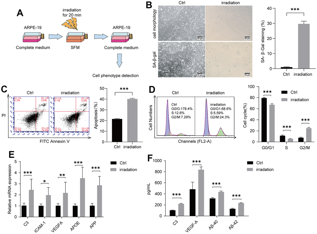 Radiation exposure could damage the lens epithelial cells of the eye to induce cataracts [40, 41]. We thus examined whether irradiation could injure retinal cells to give rise to AMD. We used ARPE-19, a human retinal pigment epithelial cell line, for irradiation at 20 min under 100 cGy/min dosage rate (Figure 1A). Cell morphology changed obviously at 96 h after irradiation compared with control groups. SA-β-gal staining was also performed to assess cell senescence. The positively stained cells in the irradiated control group were obviously higher than those in the control group without irradiation (Figure 1B). Irradiation-induced apoptosis of ARPE-19 was detected via Annexin V–FITC/PI double staining. As shown in Figure 1C, irradiation increased cell apoptosis. A cell cycle experiment was then performed to examine the effect of irradiation on the ARPE-19 cell cycle progression. In irradiated cells, the percentage of ARPE-19 in the G2/M phase was enhanced compared with that in the control group, whereas the percentage of S-phase and G0/G1 cells was decreased, suggesting that the irradiation could lead to cell cycle arrest at the G2/M phase (Figure 1D). We performed a reverse transcription-quantitative polymerase chain reaction (RT-qPCR) experiment to identify that complement/inflammatory and AMD/drusen transcripts were enhanced in the irradiated group compared with the control groups (Figure 1E). In examining the secretion of C3, VEGF-A, Aβ-40, and Aβ-42 (Figure 1F) from the ARPE-19 culture supernatant medium using ELISA after irradiation, we found higher levels in the irradiated group compared with the control groups. Overall, these results suggested that irradiation could induce senescence and apoptosis of ARPE-19 cells, thereby leading to subsequent AMD formation.