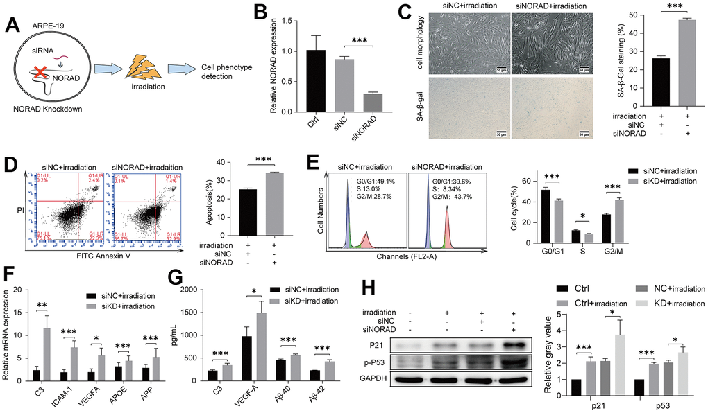 We next explored whether NORAD knockdown in the ARPE-19 cell line leads to the eventual worsening of AMD development after irradiation at a certain incubation time (Figure 2A). Small interfering RNA-targeting NORAD (siNORAD) was transfected into ARPE-19 to knock down the NORAD expression. The NORAD knockdown was verified and assessed through RT-qPCR. The NORAD expression in siNORAD cells was knocked down by 70% compared with the counterpart without small interfering RNA (siNC) cells (Figure 2B). Subsequently, we investigated whether NORAD knockdown increased the sensitivity of ARPE-19 to irradiation stress. Figure 2C shows that the cell morphology of the irradiated siNORAD group was significantly changed compared with that of the irradiated siNC group. In irradiation treatment cells, the percentage of SA-β-gal-positive cells in the siNORAD group was obviously enhanced compared with that in the siNC group (Figure 2C). The effect of NORAD-knockdown on the irradiation-induced apoptosis of ARPE-19 was detected via Annexin V–FITC/PI double staining. As shown in Figure 2D, NORAD knockdown intensively increased irradiation-induced cell apoptosis. In irradiated cells, the percentage of ARPE-19 in the G0/G1 and S phase was decreased in the siNORAD group compared with that in the siNC group, but the percentage of G2/M phase cells was enhanced significantly, indicating a G2/M phase arrest (Figure 2E). Then, we examined the mRNA level of AMD-related markers including complement/inflammatory and AMD/drusen transcripts using RT-qPCR and verified that the outcome for the irradiated siNORAD group was higher than that for the irradiated siNC group (Figure 2F). In analyzing the protein level of AMD-related markers ARPE-19 secreted, we used ELISA and found that NORAD-knockdown significantly accelerated the levels of C3, VEGF-A, Aβ-40, and Aβ-42 in culture supernatants (Figure 2G). Correspondingly, the levels of the aging-related proteins, p-P53 and P21, were significantly increased in irradiation-induced ARPE-19 cell lines. Surprisingly, NORAD knockdown accelerated the expression of p-P53 and P21 (Figure 2H). Taken together, these findings indicate that the irradiated siNORAD group presented more severe G2/M arrest, senescence, and apoptosis of ARPE-19 than the irradiated siNC group, thereby NORAD-knockdown in ARPE-19 promoted the sensitivity of ARPE-19 to irradiation damage.
