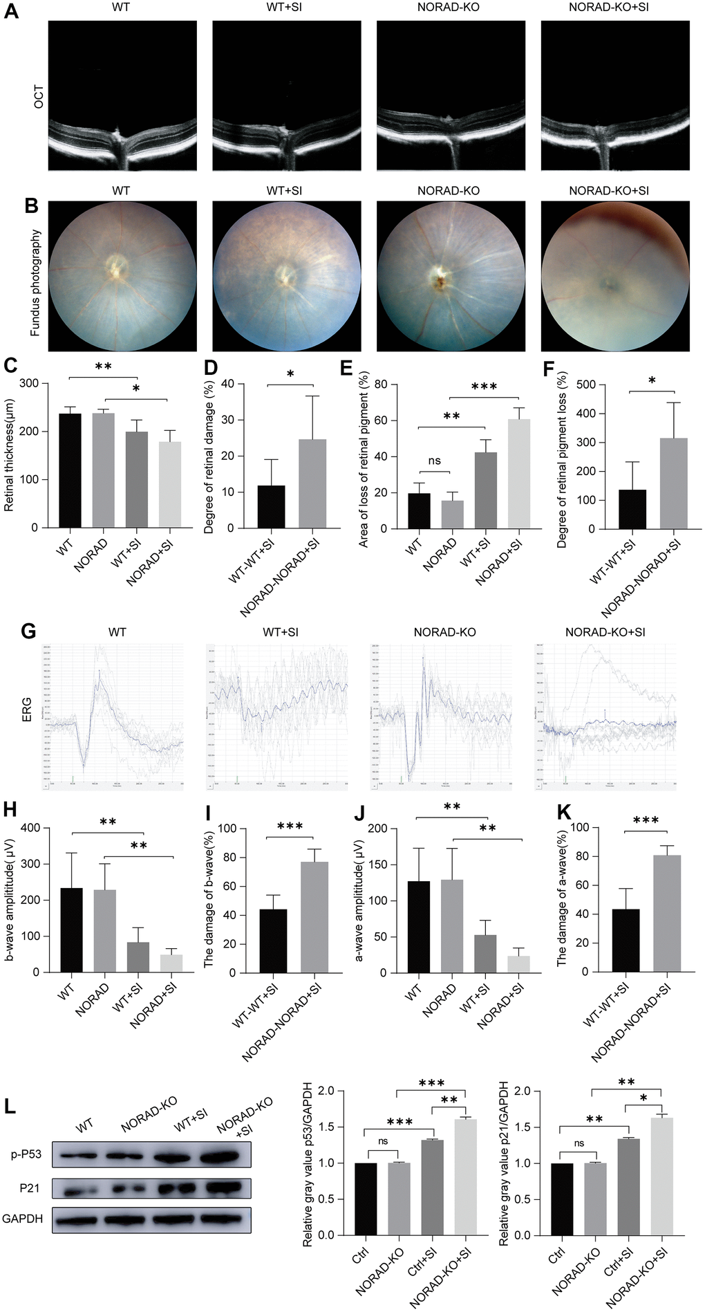 To prove that NORAD-knockout could accelerate the outside damage to the retina in vivo, we used NORAD-knockout mice injected with NaIO3 in the tail vein. After 7 days of NaIO3 treatment, OCT was employed to observe the thickness of the entire retina (Figure 3A). Little difference was observed in retinal thickness between NORAD- knockout mice and normal wild mice (Figure 3C). When we injected the mice with NaIO3, retinal thickness decreased in both wild and NORAD-knockout mice (Figure 3C), but the thickness of the retinal damage in NORAD-knockout mice was greater than that in WT mice (Figure 3D). To validate the results, we performed a funduscopic examination to evaluate the retinal pigment loss (Figure 3B). Before the NaIO3 injection, WT and NORAD-knockout mice had similar retinas (Figure 3E). After the NaIO3 injection, the fundus images of WT mice showed yellow spots on the retina, representing RPE loss by NaIO3. By contrast, the RPE loss area of NORAD-knockout mice was beyond the WT mice with NaIO3 (Figure 3F). Next, we assessed the functional integrity of the retina using electroretinography (Figure 3G). The amplitudes of the a- and b-waves of WT and NORAD-knockout mice are similar before the NaIO3 injection (Figures 3H, 3J). Moreover, the amplitudes of the a- and b-waves decreased in NaIO3-injected WT mice compared with those of the WT group without NaIO3, thereby demonstrating functional damage of the photoreceptors and dysfunction in the bipolar cells of NaIO3-injected WT mice. The amplitudes of the a- and b-waves of NORAD-out mice also decreased more than that of the wild mice (Figures 3I, 3K). We then measured the expression of p-P53 and P21 proteins in the eyes of the mice. No significant change in p53 and p21 between WT mice and NORAD-knockout mice. Conversely, the increase in p-P53 and P21 in NORAD-knockout mice was greater than that in wild mice under sodium iodate injection induced AMD model. (Figure 3L). These findings indicate that the retinas of NORAD-knockout mice were more vulnerable to injury than those of WT mice, an outcome that was consistent with in vitro results.