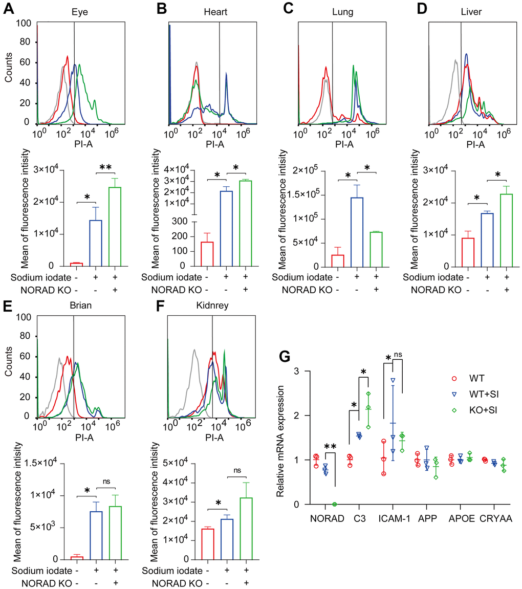 Considering that mitochondrial ROS elevation is a reason for the increase of p-P53 and P21, we tested the mitochondrial ROS production in multiple organs of mice. One week after NaIO3 injection, the mitochondrial ROS in the eyes, heart, liver, lung, brain, and kidney of wild mice increased significantly, and the expression of mitochondrial ROS in the eyes, heart, and liver of NORAD-knockout mice was higher than that of wild mice (Figure 4A–4F). Next, we detected AMD markers in the eyes of mice and found that the mRNA levels of C3 and ICAM-1 were significantly increased in the eyes one week after NaIO3 injection, and the expression of C3 was increased in NORAD-knockout mice (Figure 4G). These results suggest that NORAD-knockout exacerbates the increase of mitochondrial ROS and C3 in the eye.