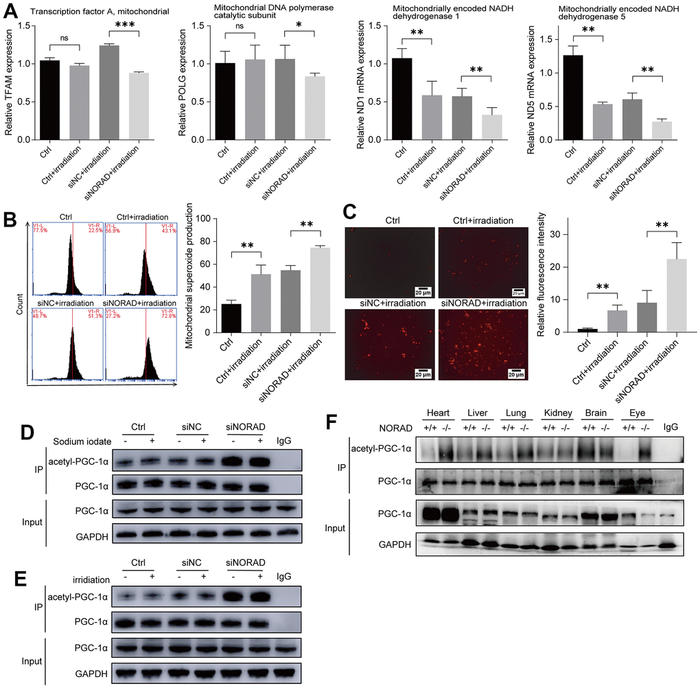 To verify the results of increased ocular mitochondrial ROS in vivo, we examined mitochondrial damage and mitochondrial ROS production in vitro using an irradiation-induced AMD model. To explore the effect of NORAD-knockdown on mitochondrial genes under irradiation, we conducted an RT-qPCR experiment and determined that irradiation decreased the mitochondrial homeostasis factors TFAM and POLG and mitochondrial respiratory chain complex genes ND1 and ND5 compared to a control group. However, NORAD-knockdown exacerbated the decrease of these mitochondrial genes (Figure 5A). MitoSOX staining revealed that irradiation increased the mitochondrial ROS compared with the control group. By contrast, the increase in mitochondrial ROS production was further aggravated upon NORAD-knockdown treatment (Figure 5B). The results were validated by fluorescence microscope photography (Figure 5C). As only non-acetylated PGC-1α can activate mitochondrial oxidative processes and inhibit the production of mitochondrial ROS, we examined PGC-1α acetylation under conditions of pathological damage. We found that NaIO3 and irradiation did not increase PGC-1α acetylation. Conversely, NORAD knockdown increased PGC-1α acetylation under both pathological and non-pathological conditions (Figures 5D, 5E). To validate the effect of NORAD on PGC-1α, we detected PGC-1α acetylation in various organs of NORAD-knockout mice. NORAD knockout increased PGC-1α acetylation in the heart, liver, lung, and eye, but was less explicit in the kidney and brain (Figure 5F). These findings indicate that the effect of NaIO3 and irradiation on PGC-1α acetylation is not obvious; nevertheless, NORAD knockdown could promote PGC-1α acetylation.