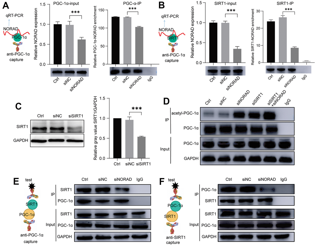 According to the literature, PGC-1α, SIRT1, and NORAD interact with one another, so we performed RNA binding protein immunoprecipitation assay experiments (RIP) to determine whether both PGC-1α and SIRT1 interact with NORAD (Figures 6A, 6B). On the premise that the degree of binding between SIRT1 and PGC-1α influenced PGC-1α acetylation, we then detected PGC-1α acetylation after SIRT1 knockdown, NORAD knockdown, and combined SIRT1 and NORAD knockdown using an immunoprecipitation (IP) experiment. SIRT1 knockdown was confirmed by WB (Figure 6C). We verified that both SIRT1 knockdown and NORAD knockdown increased PGC-1α acetylation with similar effects (Figure 6D). The simultaneous knockdown of SIRT1 and NORAD had a cumulative effect on PGC-1α acetylation (Figure 6D). The presence of both SIRT1 and NORAD, therefore, exerts an effect on PGC-1α acetylation. We also hypothesized that the presence of NORAD facilitates SIRT1 and PGC-1α binding. Therefore, we detected SIRT 1 and PGC-1α binding through co-immunoprecipitation (co-IP) experiments. When we captured SIRT1 with antibodies against PGC-1α, we were able to drag SIRT1 down (Figure 6E); conversely, we were also able to drag down PGC-1α with antibodies against SIRT1 (Figure 6F). Thus, SIRT1 and PGC-1α were bound to each other. Surprisingly, when NORAD was knocked down, the amount of SIRT1 dragged down by the PGC-1α antibody and the amount of PGC-1α dragged down by the SIRT1 antibody both decreased (Figure 6E, 6F). These outcomes indicate that the presence of NORAD is conducive to the binding of SIRT1 and PGC-1α, thus promoting PGC-1α deacetylation by SIRT1.