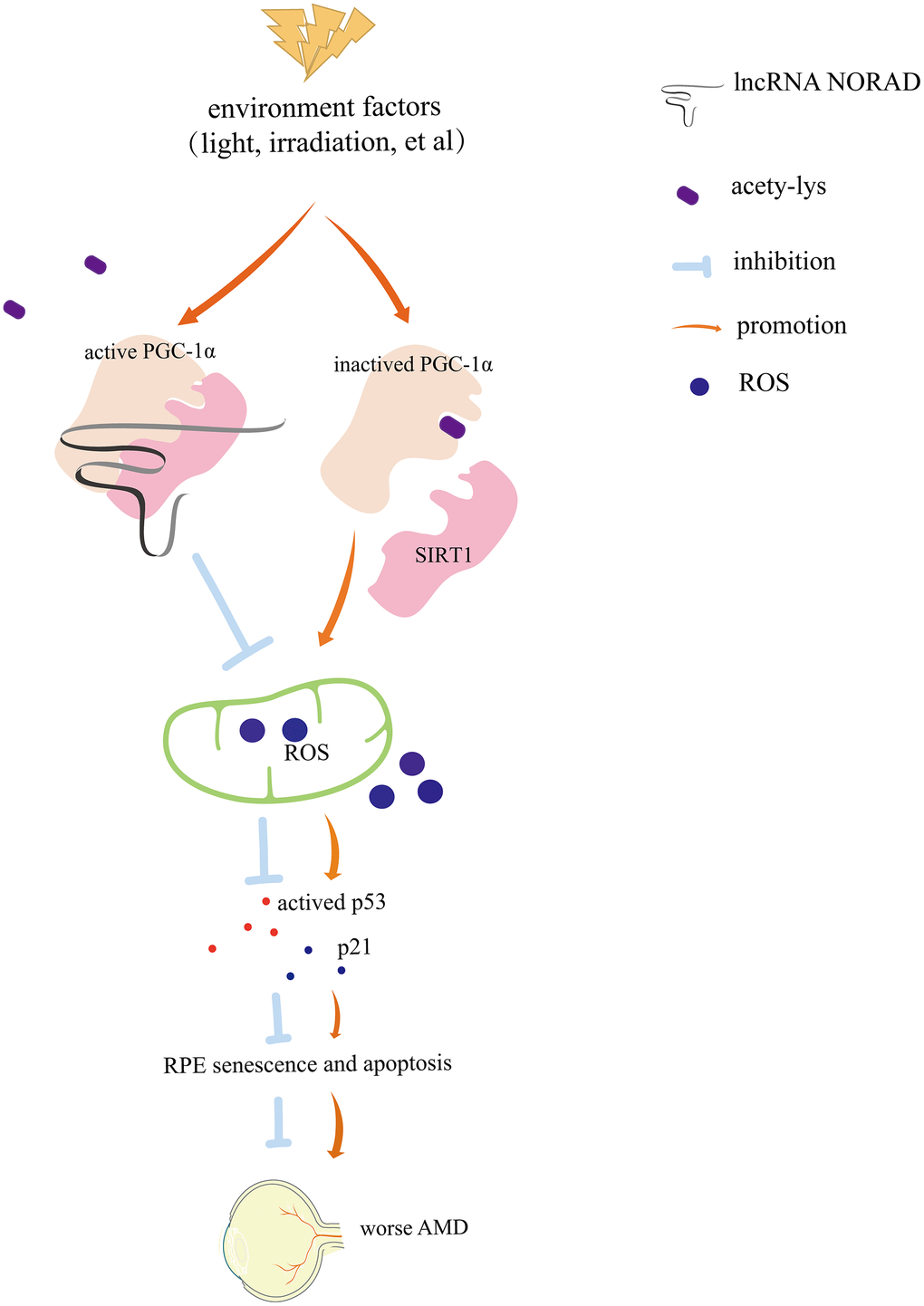 Aging is associated with structural and functional changes of the retina that predispose an individual to the development of AMD and contributes to the additive effects of other pathological risk factors over time [23–25]. The role of PGC-1α in mitigating senescence has been explored that PGC-1α deficiency and inactivation of PGC-1α by acetylation induce cellular senescence with elevated mitochondrial ROS levels, abnormalities of mitochondrial structure, increased p53 levels [26, 27]. Downregulation of SIRT1 expression promotes PGC-1α acetylation and depletion of PGC-1α or SIRT1 induces senescence [26]. PGC-1α plays a pivotal role in improving mitochondrial function and ameliorating oxidative stress via the upregulation of genes for improving mitochondrial biogenesis such as the case of TFAM [28, 29]. PGC-1α has also been implicated in reactive oxygen species (ROS) detoxification and protection from neurodegenerative disease in the brain [30]. An anti-aging role of PGC-1α in a lower organism was also recently reported [31]. However, additional studies that incorporate age as a variable are needed to definitively explain the role of NORAD and PGC-1α in AMD.
