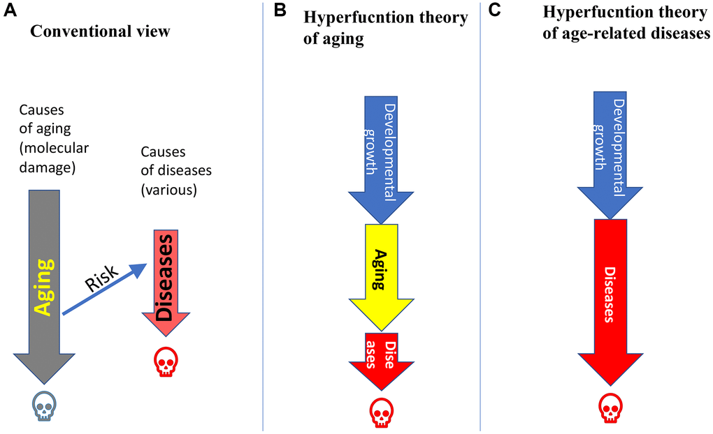 According to a dominating notion, aging is caused by accumulation of molecular damages, leading to functional decline and death. Age-related diseases (ARDs) are caused by other causes, such as unhealthy lifestyle and “genetics” (Figure 1A). Accordingly, aging is just a risk factor for diseases (but this explains little. Why is it a risk factor?) but not a cause. (For example, hypertension is not caused by accumulation of molecular damages). With a healthy lifestyle, aging will cause a “healthy” death (I slightly inflate). Otherwise, a person will die prematurely from age-related diseases (Figure 1A).