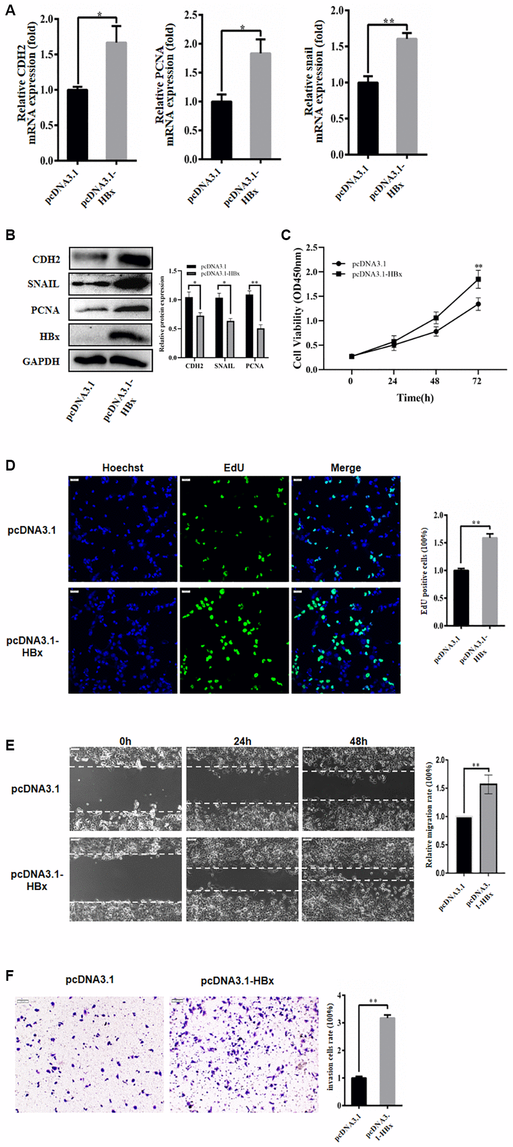 In this study, we investigated the impact of HBx on the proliferation, migration, and invasion of HCC cells through the evaluation of molecular markers’ expression after overexpressing HBx in Huh-7 cells. We examined the mRNA expression of respective markers by qRT-PCR and found that the expression of N-cadherin and Snail was greatly increased after HBx overexpression (Figure 1A, 1B). Subsequently, we assessed cell proliferation using both EdU and CCK-8 assays in the Huh-7 cell line. Our results showed that HBx overexpression accelerated the cell cycle in the CCK-8 assay and also promoted Huh-7 cell growth in the EdU experiment (Figure 1C, 1D). At the same time, we found that overexpression of HBx promoted migration and invasion of hepatocellular carcinoma cell line (Figure 1E, 1F). These findings suggest that HBx may play a role in promoting the proliferation, migration, and invasion of hepatoma carcinoma cells.