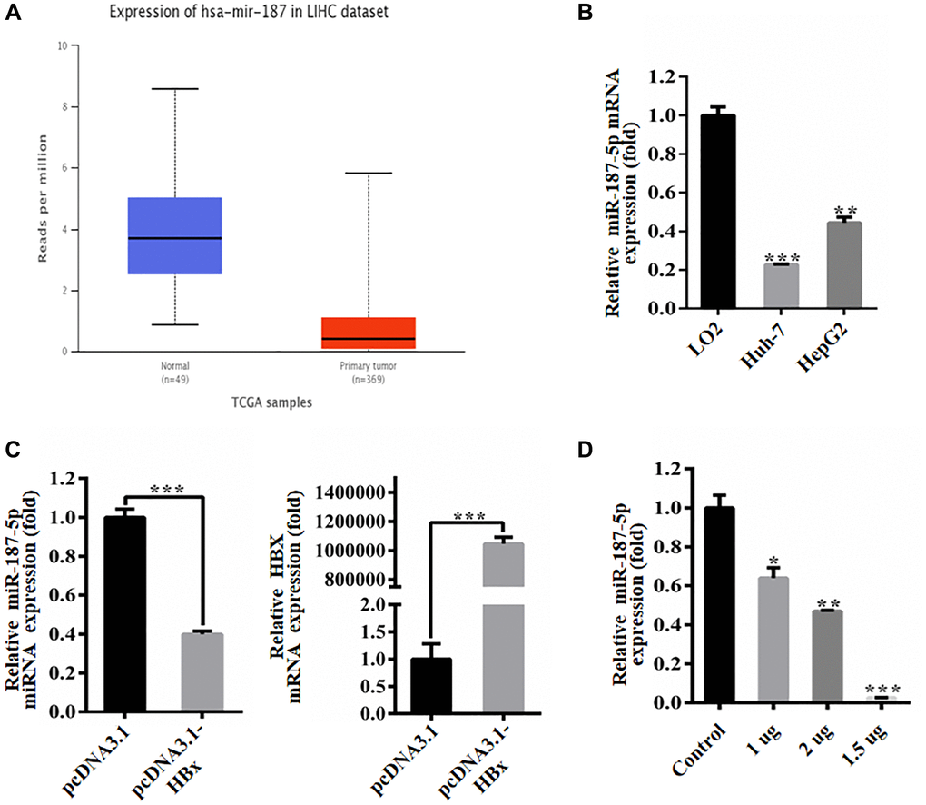 MicroRNAs (miRNAs) are short non-coding RNAs of 19–25 base pairs that control gene expression by binding to mRNA targets’ 3′-untranslated region (3′-UTR) [5]. It is predicted that the human genome can encode more than 2600 miRNAs, and a single miRNA can target and regulate the expression of at least 200 mRNAs and regulate the expression of more than 15,000 genes [6]. miRNA can regulate various carcinogenic molecules, signaling pathways, and function as unstable regions of the genome [7]. HBx is reported to change the miRNA expression profile in liver cancer cells, which can be used as potential diagnostic markers for HCC. Recent studies indicated that the miR-187-5p gene on chromosome 18q12.2 played a significant role in tumor regulation [8, 9]. miR-187-5p has been shown to be down-regulated in giant cell tumors of bone [8], and non-small cell lung cancer [9] but up-regulated in triple negative breast cancer [10], gastric cancer [11], and bladder cancer [12] as an oncogene.