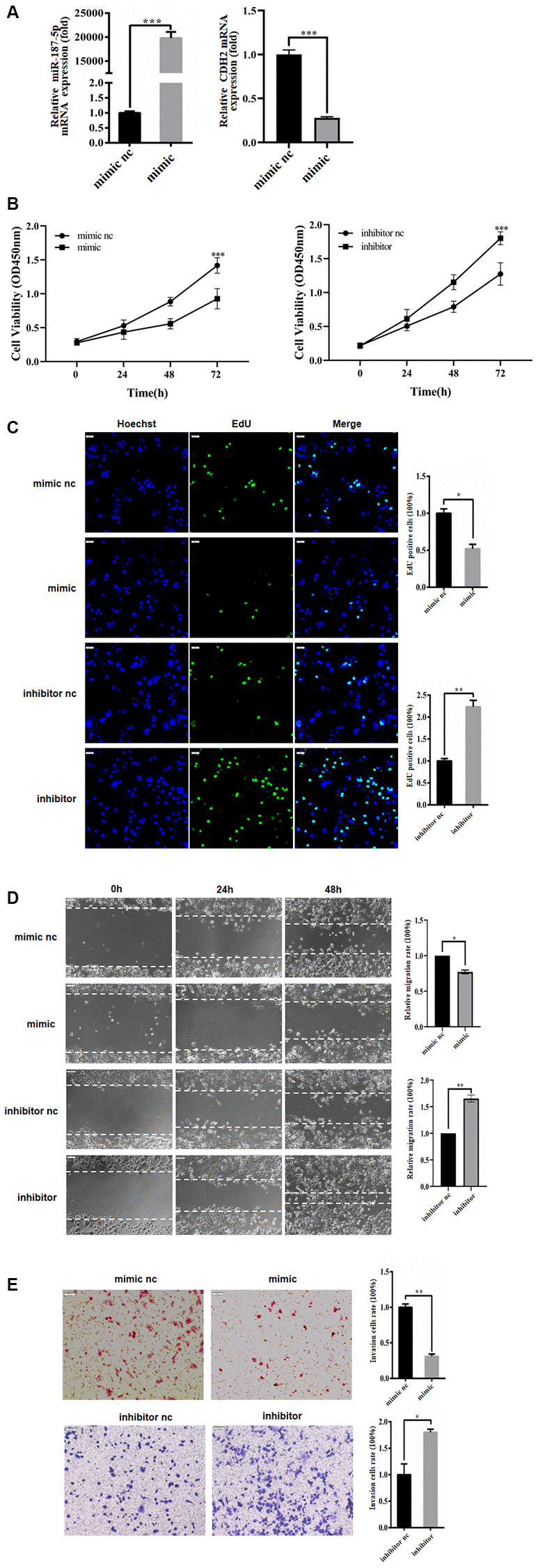To investigate the influence of miR-187-5p on hepatoma carcinoma cells, Huh-7 cells were transfected with either miR-187-5p mimics or negative control, followed by qRT-PCR to evaluate CDH2 mRNA expression. The results revealed that transfection with miR-187-5p mimics led to a noticeable reduction in CDH2 expression in Huh-7 cells, indicating a decrease in cell proliferation and cell cycle progression as demonstrated by EdU and CCK-8 assays (refer to Figure 3A–3C). Subsequently, wound healing assays were conducted using 6-well plates after transfecting the Huh-7 cells with miR-187-5p mimics or inhibitors for 48 hours. The findings indicated that the transfection of miR-187-5p mimics led to a significant decrease in Huh-7 cell migration ability compared to the control group. On the other hand, miR-187-5p inhibition transfection led to enhanced cell migration ability, suggesting that miR-187-5p may have a suppressive effect on Huh-7 cell migration (refer to Figure 3D). To further explore the impact of miR-187-5p on the invasive capacity of hepatoma carcinoma cells, Transwell assays were performed. Intriguingly, the invasive ability of Huh-7 cells with miR-187-5p mimics expression was significantly reduced relative to the control group. Conversely, the Huh-7 cells with miR-187-5p suppressor expression exhibited a considerable increase in invasive ability. In light of these observations, it can be deduced that miR-187-5p may modulate the invasive ability of liver cancer cells (refer to Figure 3E).