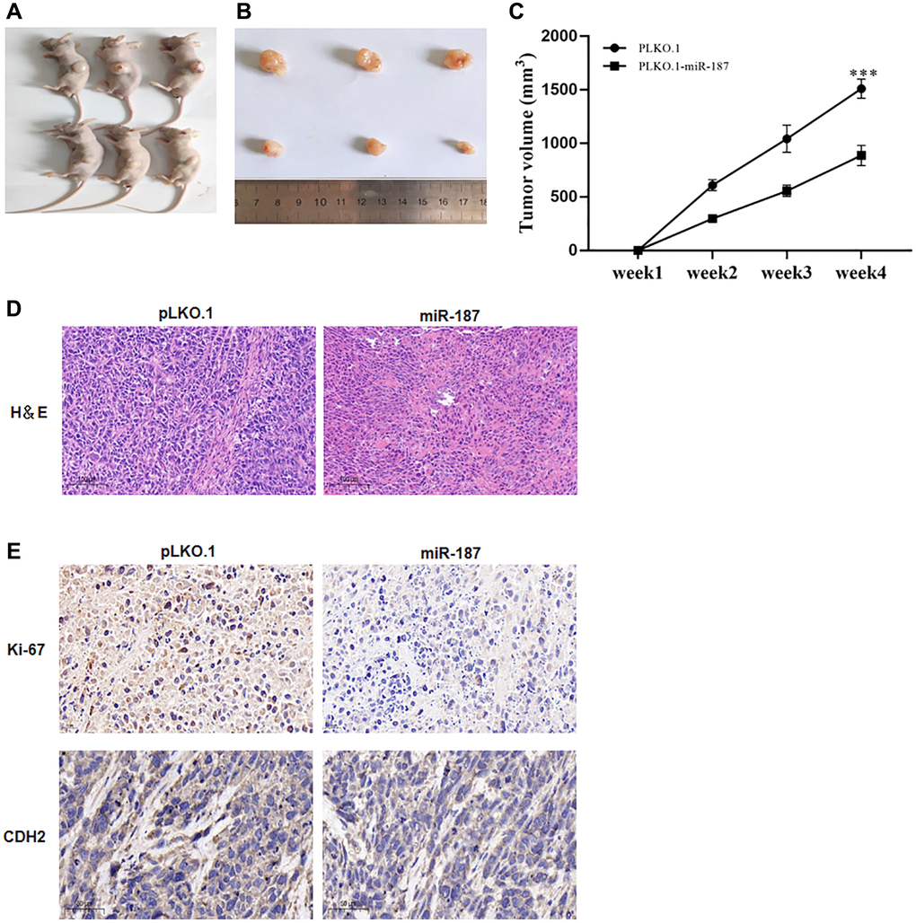 In vivo experiments have confirmed the impact of miR-187 on tumor development. Specifically, nude mice were injected with Huh-7 cells that had been transduced with lentivirus expressing pLKO, pLKO.1-NC, and pLKO.1-miR-187, respectively. The resulting tumor growth was then observed and compared between the two groups. As depicted in Figure 4A, 4B, overexpression of miR-187-5p led to a suppressed tumor growth, as evidenced by reduced tumor weight and size, whereas the control group exhibited accelerated tumor growth (Figure 4C). Subsequently, subcutaneously transplanted tumors were analyzed via H&E staining, which showed that miR-187-5p overexpression led to a decrease in the degree of pathological lesions within the tumors (Figure 4D). Notably, compared to the NC group, a significant reduction in nuclear size and lighter nuclear staining were observed in the miR-187 overexpression group. Immunohistochemistry was then performed to measure CDH2 and Ki67 expression levels within the tumors. Results revealed that elevated levels of CDH2 and Ki67 expression were detected in the control group (Figure 4E), while down-regulated levels were observed in the miR-187 overexpression group, further supporting the suppressive effect of miR-187 on tumor growth.