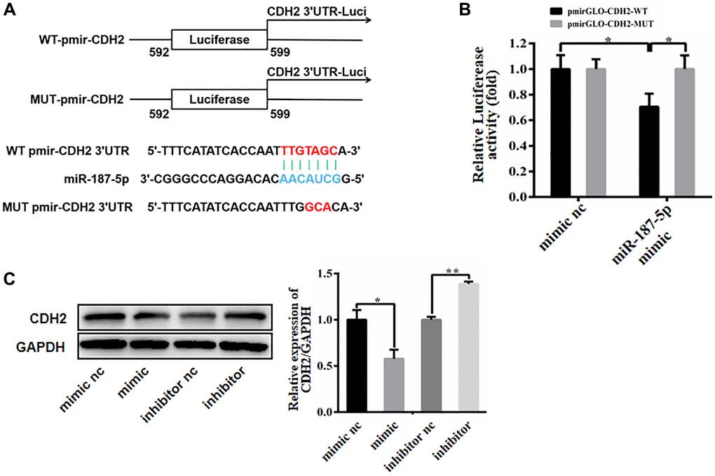 We predicted the 3′-UTR of CDH2 using the TargetScanHuman website tool to investigate how miR-187-5p regulates CDH2 expression. The result discovered a miR-187-5p-specific binding site (Supplementary Figure 1A). To determine whether miR-187-5p binds to the CDH2 3′-UTR, two luciferase vectors containing either the WT-CDH2-3′-UTR (WT-pmirGLO-CDH2) or the MUT-CDH2-3′-UTR (MUT-pmirGLO-CDH2) were generated (Figure 5A). When WT-pmirGLO-CDH2/MUT-pmirGLO-CDH2 and OE-miR-187-5p/OE-Ctrl were co-transfected into 293T cells. Overexpression of miR-187-5p was shown to inhibit the activity of the CDH2 WT luciferase vector and had lightly effect on the activity of the MUT vector (Figure 5B). MiR-187-5p overexpression may reduce CDH2 protein levels, whilst miR-187-5p inhibition might increase CDH2 protein levels (Figure 5C). All of the findings showed that miR-187-5p decreased CDH2 expression by targeting its 3′-UTR.