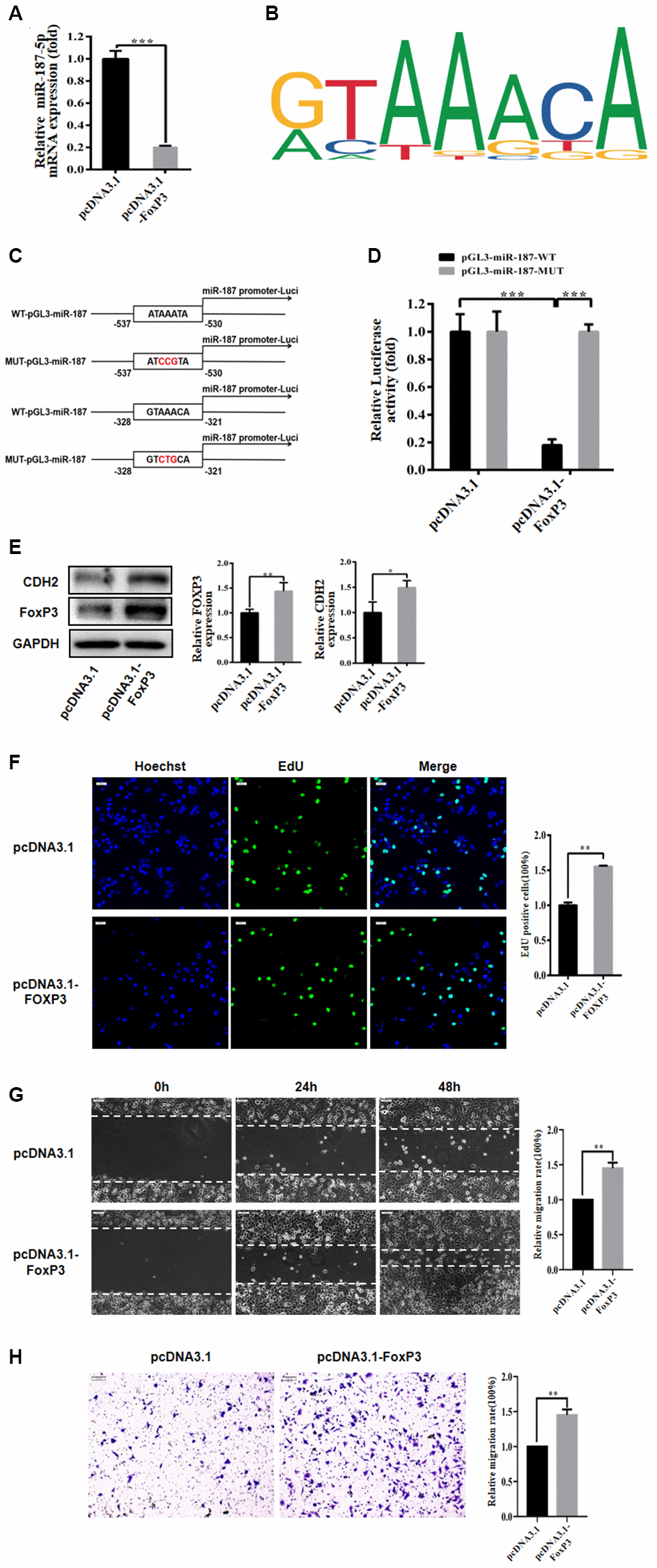 The bioinformatic analysis websites UALCAN, TargetScan, ALGGEN, and JASPAR were used to determine miR-187-5p expression, the miR-187-5p binding site to CDH2, the promoter binding site of E2F1 to FoxP3, the promoter binding site of FoxP3 to miR-187-5p, and the classical binding sites of E2F1 or FoxP3.