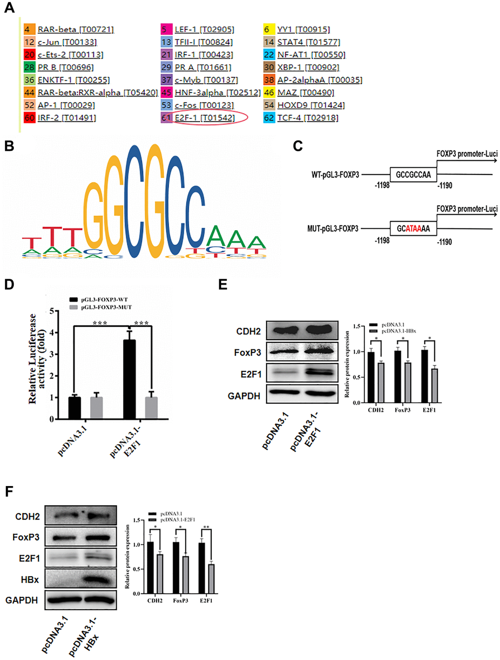 To investigate how HBx influences FoxP3 expression, we utilized the PROMO website to predict the FoxP3 promoter (Figure 7A). In the FoxP3 promoter region, we uncovered an E2F1 binding site (Figure 7B). WT pGL3-FoxP3 (a luciferase reporter plasmid with wild type FoxP3 promoter sequence) and MUT pGL3-FoxP3 (a luciferase reporter plasmid with mutant FoxP3 promoter sequence) were constructed to verify FoxP3 promoter activity in hepatoma carcinoma cell (Figure 7C). Then we co-transfected WT pGL3-FoxP3 and MUT pGL3-FoxP3 into 293T cells with pcDNA3.1 and pcDNA3.1-E2F1. Luciferase activity was found after 36 hours transfection. The results revealed that pcDNA3.1-E2F1 transfection could considerably boost the WT pGL3-FoxP3 vector’s luciferase activity but had little effect on the MUT pGL3- FoxP3 vector’s activity (Figure 7D). We then looked at how E2F1 plasmid transfection affected the expression of FoxP3 and CDH2 in the Huh-7 cell line. When compared with the control group, E2F1 significantly increased FoxP3 protein expression (Figure 7E). The western blot findings also demonstrated that HBx increased the expression of E2F1 (Figure 7F).