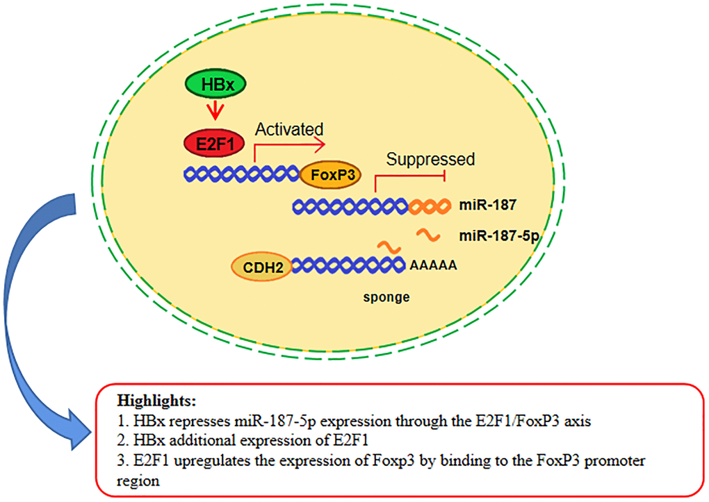 FoxP3 is one of the fork-head box (fox) transcription factor and functions as a transcription factor in multiple cells [13]. The multifaceted nature of Foxp3, a transcription factor of considerable importance, cannot be overstated. Not only does it play a crucial role in promoting transcription, but it also exhibits suppressive properties. Intriguingly, studies have shown that high expression of Foxp3 can activate T cells, adding yet another layer of complexity to its already impressive repertoire of functions [14]. It has been reported that FoxP3 is expressed both in CD4+ T regulatory cells and tumor cells, including pancreatic cancer cells, melanoma cells etc. [15–17]. Studies have shown that mutations in the FoxP3 gene are widely involved in human autoimmune diseases [18]. Furthermore, TGF-2 and IL-10 are among the cytokines FoxP3 regulates, and thus promotes tumor cells to evade immunity and to deteriorate further [19]. E2F1 belongs to the E2Fs family which is a transcription factor of 437 amino acids. It contains a DNA binding domain (DBD) and a trans-activation domain (TDD), necessary for binding to target genes [20]. Some amino acid sequence in the TDD bound to retinoblastoma protein (pRB) inhibits the transcriptional activity of E2F1 [21] in turn. Moreover, E2F1 was found to promote gene transcription [22] by interacting with transcription factors in members of the DP family to form an E2F1/DP heterodimer structure. By co-factor binding and subcellular localization [23]. E2F transcriptional activity is regulated by transcriptional and translational processes, post-translational changes, and protein degradation throughout the cell cycle. Based on bioinformatic research, we discovered that HBx inhibits miR-187-5p expression in HCC cell lines [24]. The association between HBx and miR-187-5p and the mechanism underneath triggered our interest. In this study, we explored the interaction mechanism among HBx, miR-187-5p and transcription factors E2F1 and FoxP3 in hepatocellular carcinoma cells. In order to clarify the molecular mechanism involved in HCC occurrence and progression by HBx.