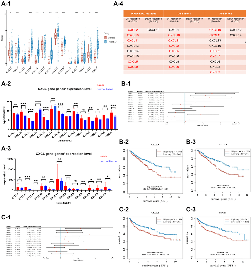 Fourteen CXCL genes were found in the Gene Bank database (https://www.ncbi.nlm.nih.gov/gene/), including CXCL 1, 2, 3, 5, 6, 8, 9, 10, 11, 12, 13, 14, 16, and 17. The mRNA expression levels of these genes were then compared across three renal cancer datasets. 1. The mRNA expression of eight genes (CXCL 2, 5, 9, 10, 11, 13, 14, and 16) was increased in cancer tissue of the TCGA-KIRC dataset (Figure 1A-1) (P < 0.05), while only CXCL 12 was downregulated (P < 0.05). 2. The mRNA expression of eight genes (CXCL 1, 2, 5, 6, 8, 9, 10, and 11) was increased in cancer tissue of the GSE15641 dataset (Figure 1A-2) (P < 0.05). 3. The mRNA expression of nine genes (CXCL 2, 5, 6, 8, 9, 10, 11, 13, and 16) was increased in cancer tissue of the GSE14762 dataset (Figure 1A-3) (P < 0.05), while CXCL 12 and 14 were downregulated (P < 0.05). Further analysis showed that five CXCL genes (CXCL 2, 5, 9, 10, and 11) had increased mRNA expression in renal cancer tissue across all three datasets (Figure 1A-4).
