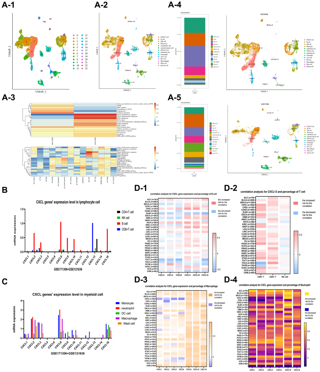 The function and mechanism of CXCL genes were evaluated using single-cell analysis based on two single-cell datasets of renal cancer, GSE171306 and GSE121636. Two samples of GSE171306 (GSM5222644 and GSM5222645) and three samples of GSE121636 (GSM3440844, GSM3440845, and GSM3440846) underwent detailed analysis after standard data preprocessing. The UMAP method identified 24 distinct cell clusters based on 27049 cells (Figure 3A-1). The top ten genes with the highest expression in each cluster were used to assign cell lineages, resulting in the identification of 14 cell types (Figure 3A-2), including lymphocytes (CD8+ T cells, B cells, NK cells, and CD4+ T cells), myeloid cells (monocytes, macrophages, neutrophils, DC cells, and mast cells), and other cellular units (endothelial cellular units, epithelial cellular units, plasma cellular units, and stem cellular units). Two separate plots were drawn for GSE121636 (Figure 3A-3) and GSE171306 (Figure 3A-5). A heat plot of enrichment analysis was also drawn (Figure 3A-4).