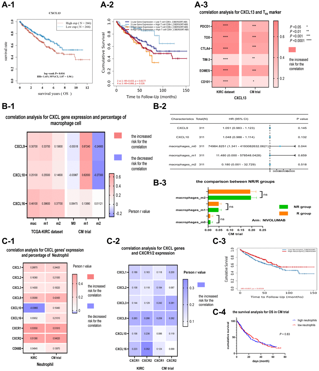 The relationship between CXCL 13 with CD8+-exhausted T cells, CXCL 9/10, macrophage M1 cells, CXCL 1/2/3/8, and neutrophils in renal cancer patients