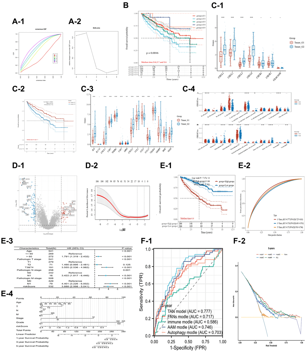 KM analysis (Figure 5E-1), time-dependent ROC analysis (Figure 5E-2), and COX regression analysis (Figure 5E-3) were performed to assess the prognostic value of the TAN risk score in patients with renal cancer. The analyses confirmed that the TAN risk score had some prognostic value in KIRC patients (P < 0.001) in the KM analysis and COX regression analysis: AUC = 0.77, 0.73, 0.75 after one, = 0.73, after three, and = five years, respectively (ROC analysis). The nomogram map (Figure 5E-4) showed that the risk score was significantly associated with clinical features, such as age and TNM stages. Compared with four other renal cancer prognostic signatures, ROC analysis (Figure 5F-1) and DCA (Figure 5F-2) showed that the TAN signature had the largest AUC value and the maximum area under the curve, respectively.