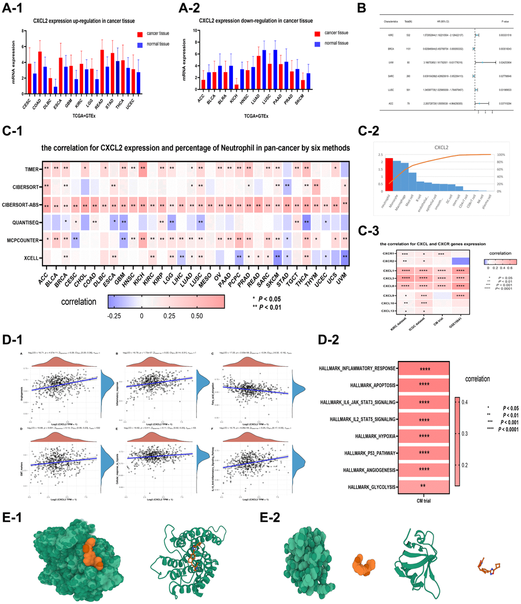 Some CXCL family genes, including CXCL8, are related to cancer progression [3]. In this study, the function and mechanism of CXCL genes in renal clear cell carcinoma (ccRcc), especially their prognostic significance and interaction with immune components, were analyzed based on multiple data sources (mRNA datasets and pan-cancer data). The results were analyzed using multiple dimensions (bulk RNA- sequencing and single-cell RNA-sequencing evaluations). Furthermore, neutrophil polarization towards a pro-tumor state promoted ccRcc development mainly mediated by CXCL2-CXCR1. Bioinformatic analysis and in vitro experiments showed that CXCL2 promotes ccRcc through many mechanisms.