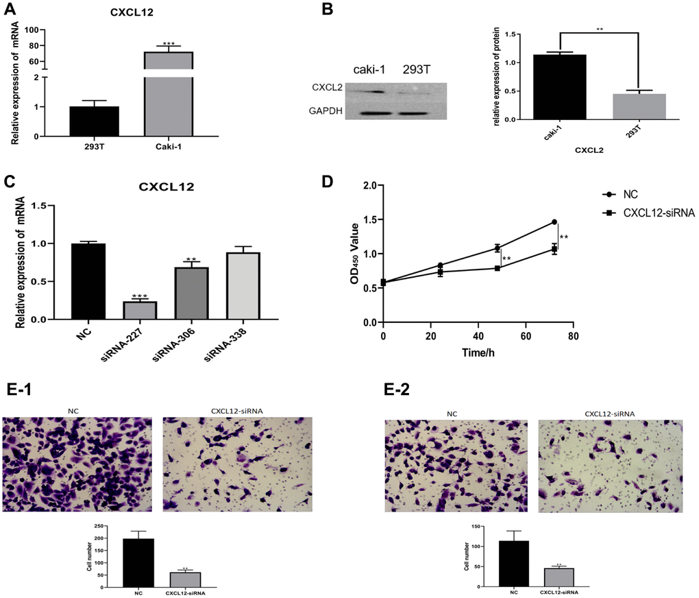 Functional comparison between the caki-1 cell line and siRNA-227 cell line was performed in terms of proliferation, invasion, and migration. The results showed that the siRNA cell line exhibited a weaker proliferation ability (determined by CCK-8 assay, P < 0.01, Figure 7D), reduced invasion (Transwell assay, P < 0.01, Figure 7E-1), and migration (Transwell assay, P < 0.01, Figure 7E-2) compared with the caki-1 cell line.