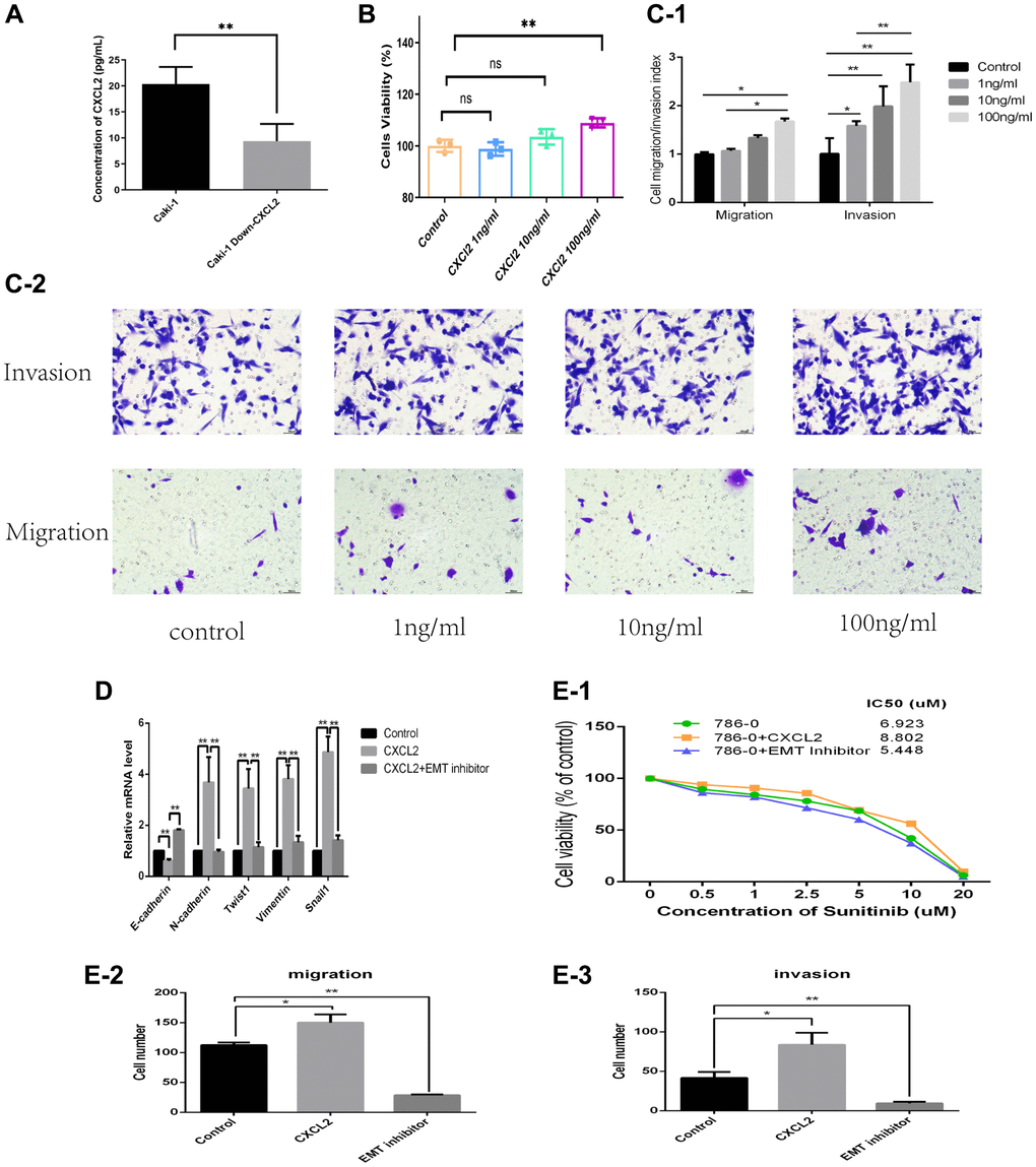 Considering that CXCL2 promoted the progression of renal clear cell carcinoma via inducing activation of the EMT process, we added the EMT pathway inhibitor (EMT inhibitor-1, 10 uM/mL, product ID: HY-101275) to the medium containing 100 ng/mL of human recombination CXCL2 protein (EMT group). Subsequently, invasion, migration, and sunitinib resistance were then explored in three cell lines (CXCL2 group, EMT group, and NC group). Results indicated that the EMT group had reduced invasion and migration abilities (Figure 8E-2, 8E-3 and Supplementary Figure 2) compared with the CXCL2 group. Moreover, the IC50 test revealed that the EMT group had a lower value relative to the CXCL2 group (5.4 vs. 8.8 uM, Figure 8E-1). The expression of markers of the EMT pathway (E-cadherin, N-cadherin, Twist1, Vimentin, and Snail1) in the three groups was quantified by Q-PCR. Results showed that while E-cadherin was lower in the CXCL2 group, N-cadherin, Twist1, Vimentin, and Snail1 were higher compared with levels in the NC group. Further analysis showed that E-cadherin was increased while N-cadherin, Twist1, Vimentin, and Snail1 were decreased in the EMT group (Figure 8D) compared with levels in the CXCL2 group. These findings suggest that addition of the human recombination CXCL2 protein activated the EMT pathway in the caki-1 cell line, and activated CXCL2 inhibited the EMT pathway.