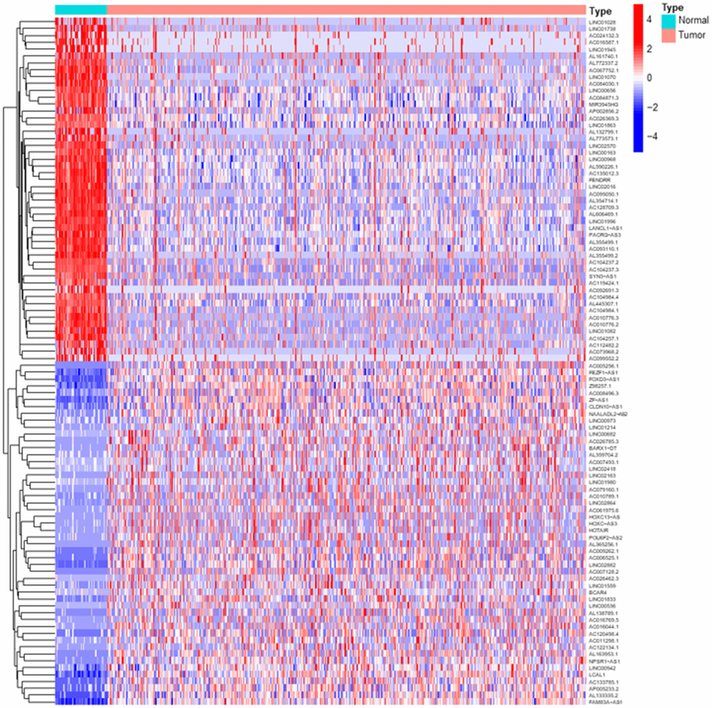 Transcriptome RNA-sequencing data and clinical data were downloaded from TCGA database. As a standard of P< 0.05 and |log2 fold change| > 1, we screened 3278 DElncRs, of which 2426 were upregulated and 852 were downregulated, and the top 50 upregulated and downregulated DElncRs were illustrated in Figure 1A. Following that, lncRNAs and mRNAs data were extracted from transcriptome data. We screened 44 MRGs in TOMIDA_METASTASIS_UP M17830 and TOMIDA_METASTASIS_DN M2583 of Molecular Signatures Database, of which 339 lncRNAs were identified to be the MRLNRs through correlation analysis.