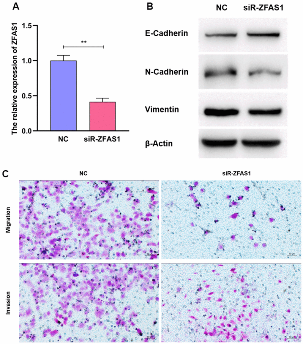 To further validate the potency of ZFAS1 in regulating the metastatic process of LUAD, ZFAS1 was silenced using siRNA in A549 cell line with the highest expression (Figure 10A). Interestingly, we found that siRNA-ZFAS1 considerably decreased the invasion and migration abilities of A549 cell line, suggesting the pro-metastatic effect of ZFAS1 (Figure 10B). Consistently, siRNA-ZFAS1 provoked the remarkable reductions of VIMENTIN and NCADHERIN in the epithelial-mesenchymal transition pathway, but showing the opposite role to the E-CADHERIN (Figure 10C). These findings indicate that lncR-ZFAS1 plays a pivotal role in promoting LUAD metastasis.