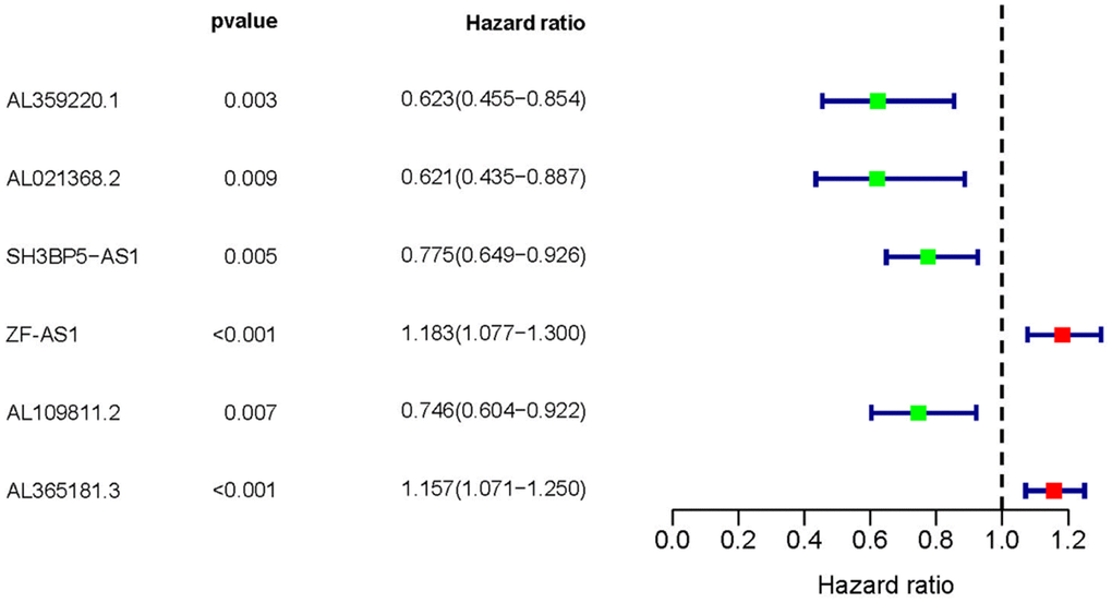 Based on COX regression analysis, we then verified 6 MRLNRs which were associated with prognosis of LUAD patients, including AL359220.1, AL021368.2, SH3BP5-AS1, AL590666.2, AL109811.2 and ZF-AS1 (p<0.01). The relationships between these sMRLNRs and LUAD prognoses were clearly illustrated in the forest plot (Figure 2).