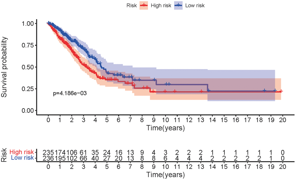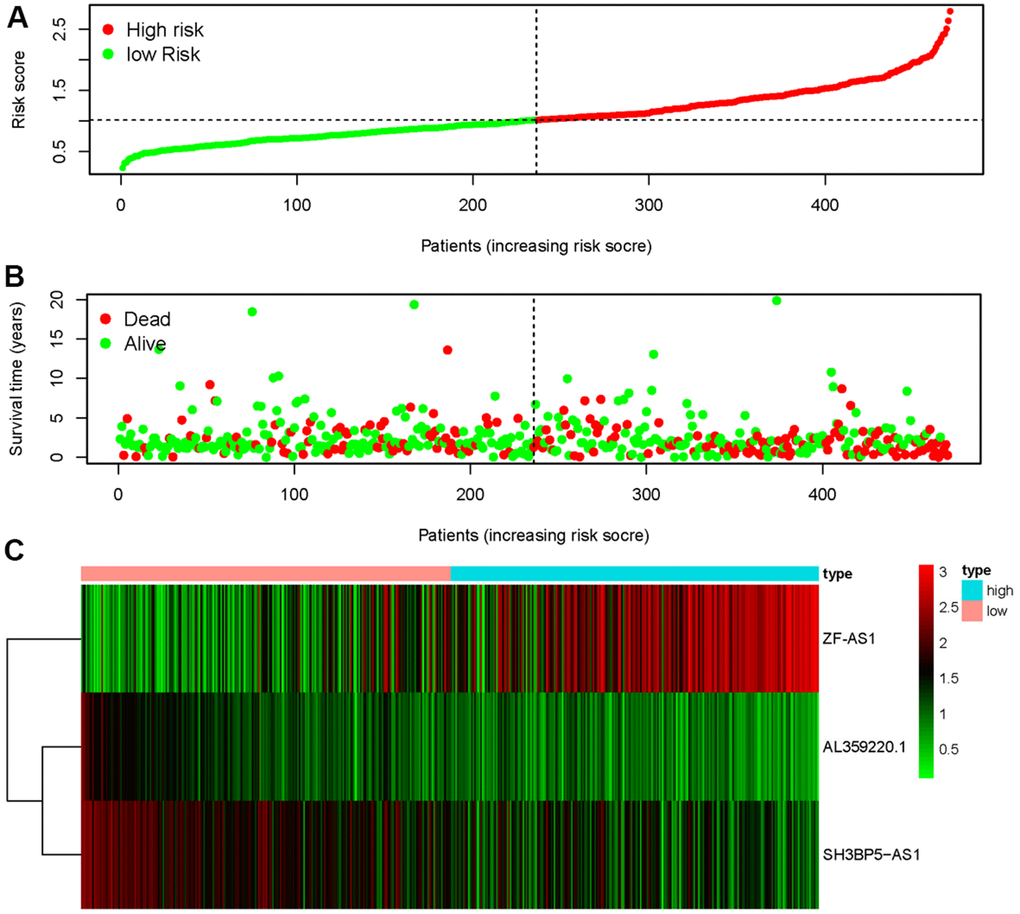 The three sMRLNRs (AL359220.1, SH3BP5-AS1 and ZF-AS1) among the 6 sMRLNRs were selected by multivariate COX analysis (P<0.05)., and were used to establish the MRRS, by which the LUAD patients were divided into the high-risk group and the low-risk group (Figure 3A). As illustrated in the Figure 3B, the mortality rate constantly increased with the higher risk score. With the increase of the risk score, the expression levels of ZF-AS1 were increased, while SH3BP5-AS1 and AL359220.1 were decreased (Figure 3C). Furthermore, the survival curve of the high-risk group was significantly lower than that of the low-risk group (Figure 4).