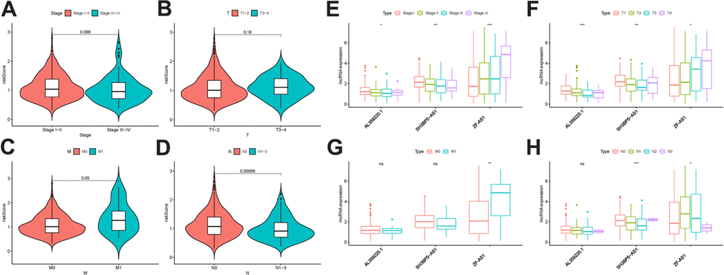 To further explore the relevance of the sMRLNRs and clinical features of LUAD, we analyzed the correlation of MRRS and the clinical and demographic characteristics including stage, T-stage and N-stage and M-stage (Figure 5A–5H). We found that the MRRS was significantly correlated with N-stage and M-stage (Figure 5C, 5D). We found the expression levels of SH3BP5-AS1 and AL359220.1 were lower in LUAD patients with the more advanced stage and T-stage (Figure 5E, 5F). Furthermore, the expression of SH3BP5-AS1 was correlated with early N-stage. Besides, the expression of ZF-AS1 was higher with the more advanced stage, T-stage, N-stage and M-stage (Figure 5E–5H). We further displayed the independent prognostic factor analysis, the results showed stage, T-stage, N-stage, M-stage and risk score were prominently correlated with OS in univariate analysis (P<0.05). However, only risk score illustrated as an independent risk factor in the multivariate analysis (Table 1). The ROC curves could represent the accuracy of the MRRS.
