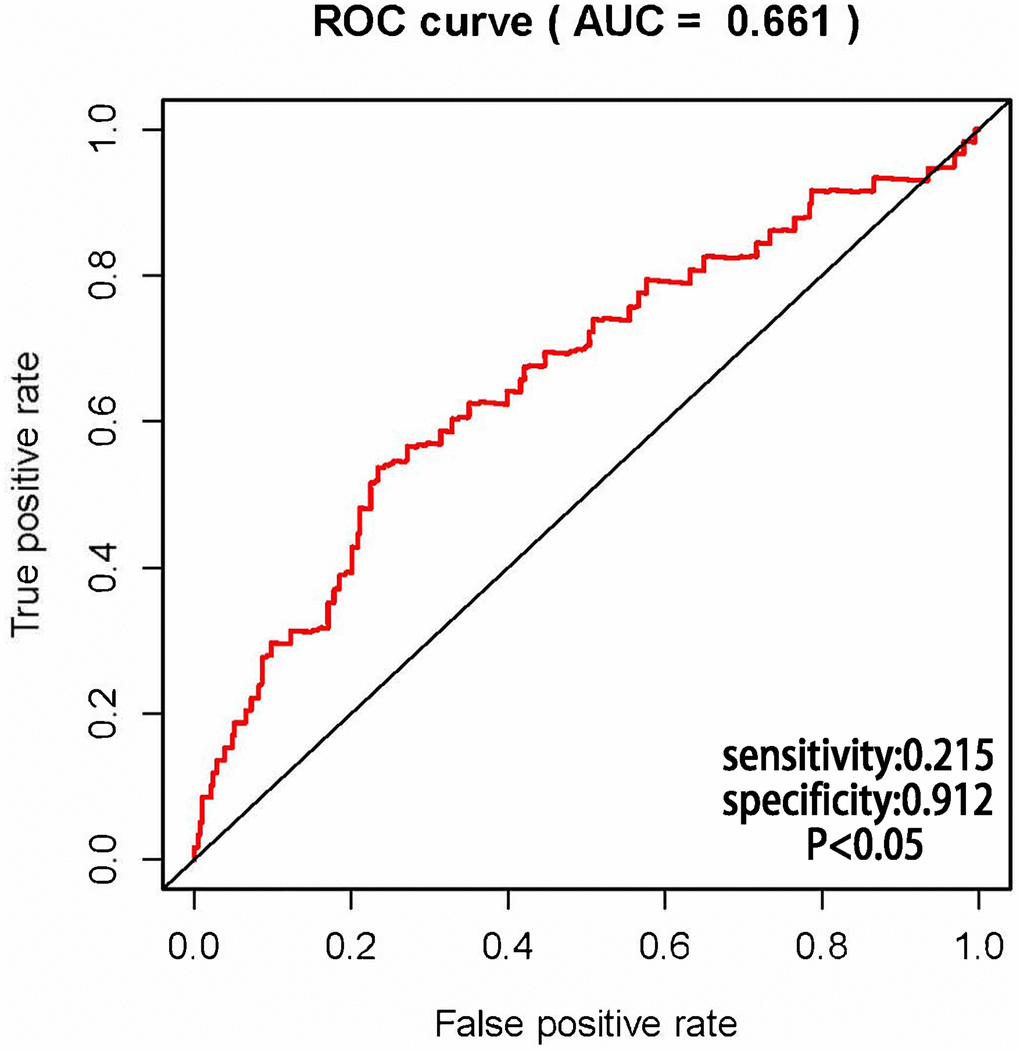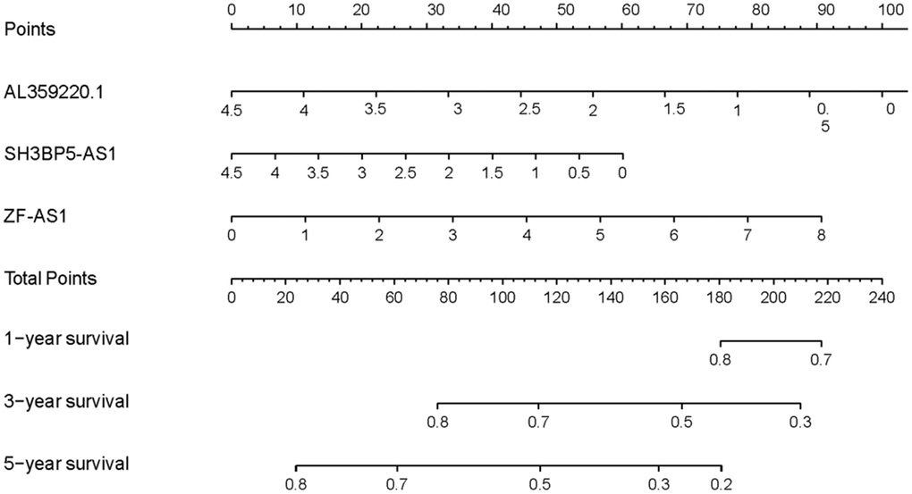 The AUCs of risk score was 0.661, sensitivity:0.215 and specificity:0.912 (Figure 6). These results suggested that the MRRS can be regarded as an accuracy predict model for LUAD. Next, the MRRS was integrated into a nomogram for predicting 1-, 3-, and 5-year survival rates of LUAD patients (Figure 7). Based on the nomogram scores, the 1-, 3-, and 5-year survival rates of LUAD patients could be well predicted by their nomogram scores. To further find the regulatory relationships of sMRLNRs and their target microRNAs, we selected the microRNAs of Starbase database and the results were demonstrated in regulatory network (Figure 8).