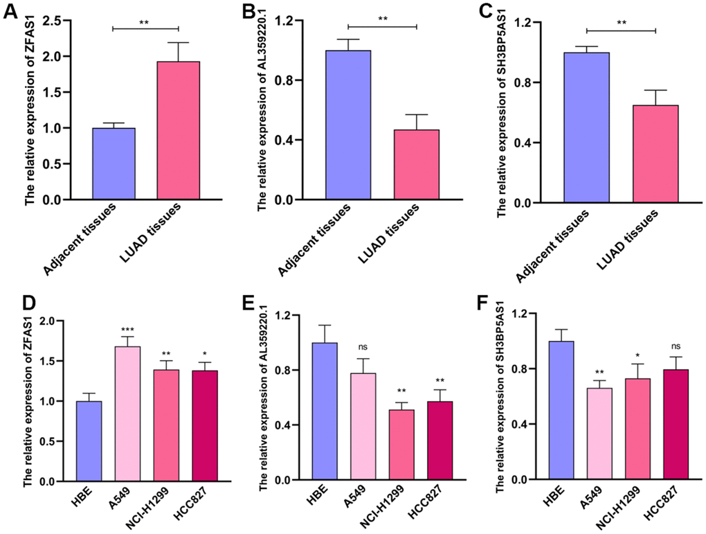 Then, we examined the levels of these sMRLNRs which were used to establish the MRRS in various LUAD tissues and cell lines, and found that ZFAS1 expressed highly in tumor tissues and showed the inverse results compared to SH3BP5-AS1 and AL359220.1 (Figure 9A–9C). Consistently, the expression of ZFAS1 in LUAD cell lines (A549, NCI-H1299 and HCC827) was dramatically higher than that in normal bronchial epithelial cell line, while SH3BP5-AS1 and AL359220.1 expressed increasingly in HBE cell line (Figure 9D–9F).