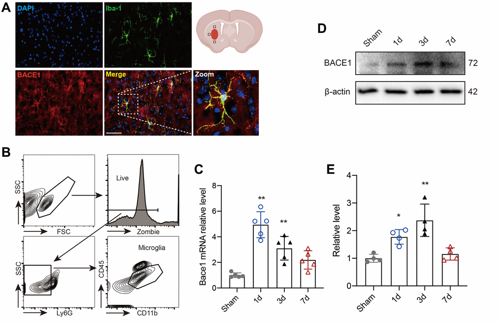 BACE1 protein levels and activity in microglia were shown to be increased in several neurological diseases [12, 17, 18]. Here, we investigated the location and expression of BACE1 in microglia following ICH-mediated acute injury. We found that activated microglia from mouse brains 3 d post-ICH showed strong colocalization of BACE1 with ionized calcium-binding adapter molecule 1 (IBA-1) (Figure 1A). We isolated microglia (CD45intCD11b+) in the striatum from mouse brains at different time points after ICH modeling (Figure 1B) and measured the temporal expression of microglial Bace1. The expression of BACE1 peaked rapidly at 1 day post-ICH and persisted until 3 days, while the mRNA level showed no significant difference with baseline at 7 days after ICH (Figure 1C). Consistently, Western blotting also indicated that the protein level of microglial BACE1 significantly increased at Day 1 and Day 3 post-ICH (Figure 1D, 1E). Hence, BACE1 was elevated in ICH-affected microglial cells at an early stage.