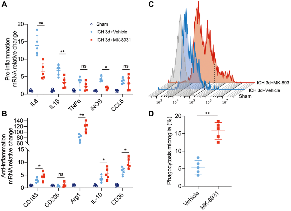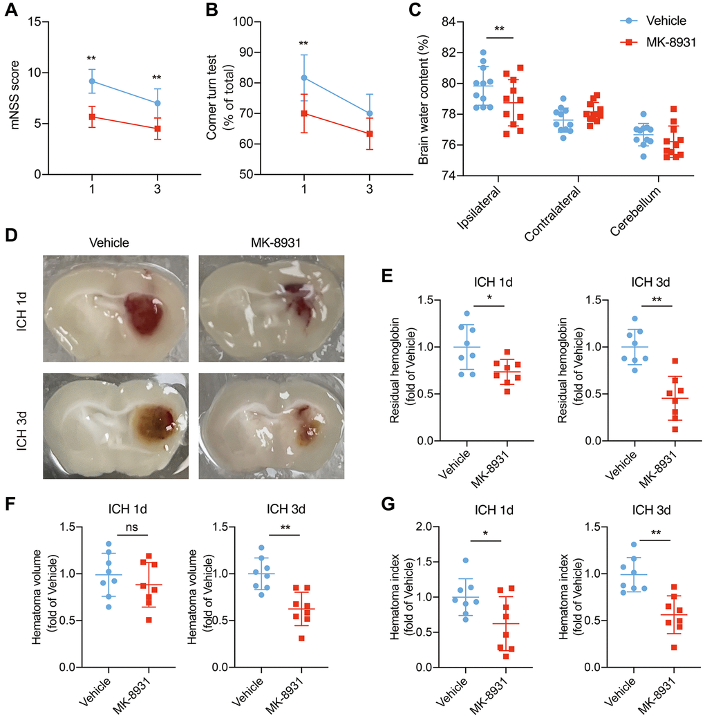MK-8931 was purchased from MedChemExpress, USA (HY-16759). For in vivo experiments, MK-8931 was orally administered at a dose of 10 mg/kg per day until the mice were sacrificed [17]. For in vitro experiments, primary microglia treated with 100 nM MK-8931 [10] or vehicle were maintained in DMEM under 30 μM hemoglobin (Hb) exposure for 12 h [35].