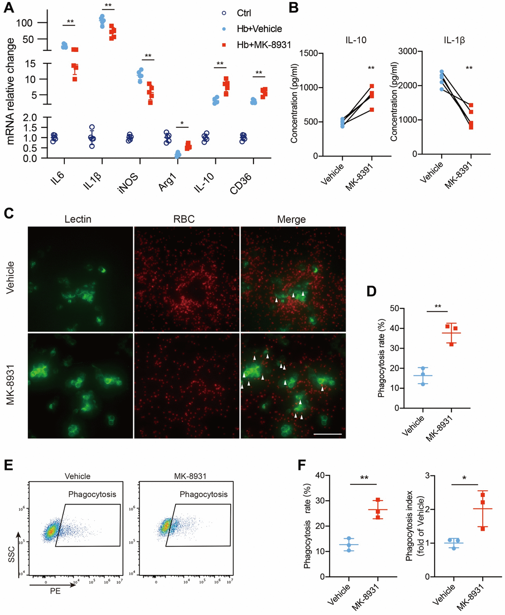To further determine the role of BACE1 in microglial inflammatory and phagocytic phenotypes, we used hemoglobin (Hb)-treated primary microglia (PMG) as an in vitro model of ICH [21]. The BACE1 protein level was increased at 6 and 12 h after Hb stimulation (Supplementary Figure 1). Then, we analyzed cytokine gene expression in the MK-8931- or vehicle-treated PMG. Consistent with the in vivo results, proinflammatory cytokines (IL-6, IL-1β, iNOS) were significantly reduced by MK-8931, while anti-inflammatory/pro-phagocytosis molecules were dramatically increased (Figure 4A), and the results also validated by BACE1-targeted siRNA (Supplementary Figure 2A, 2B). The secreted IL-10 levels also increased significantly after MK-8931 treatment, while the secreted IL-1β levels decreased significantly in the PMG (Figure 4B). Thus, inhibition of BACE1 contributes to the conversion of microglia to an anti-inflammatory phenotype. We further measured the phagocytosis rate of the Hb-stimulated PMG with or without BACE1 inhibition by immunofluorescence and flow cytometry. We found that RBCs accumulated around the PMG, suggesting insufficient phagocytosis. In contrast, the number of intracellular fluorescence-labeled RBCs was significantly increased after the administration of MK-8931, and the aggregation of RBCs around the PMG disappeared (Figure 4C, 4D). Quantitative analysis of the proportion of PMG that underwent phagocytosis and their fluorescence intensity (indicating that one cell may involve multiple RBCs) revealed that that pharmacological inhibition of BACE1 by MK-8901 significantly enhanced the phagocytosis of PMG (Figure 4E, 4F) as well as the genetic inhibition by siRNA (Supplementary Figure 2C, 2D). Together, our results indicated that BACE1 inhibition contributes to a greater tendency of microglia to exhibit anti-inflammatory and pro-phagocytic phenotypes.
