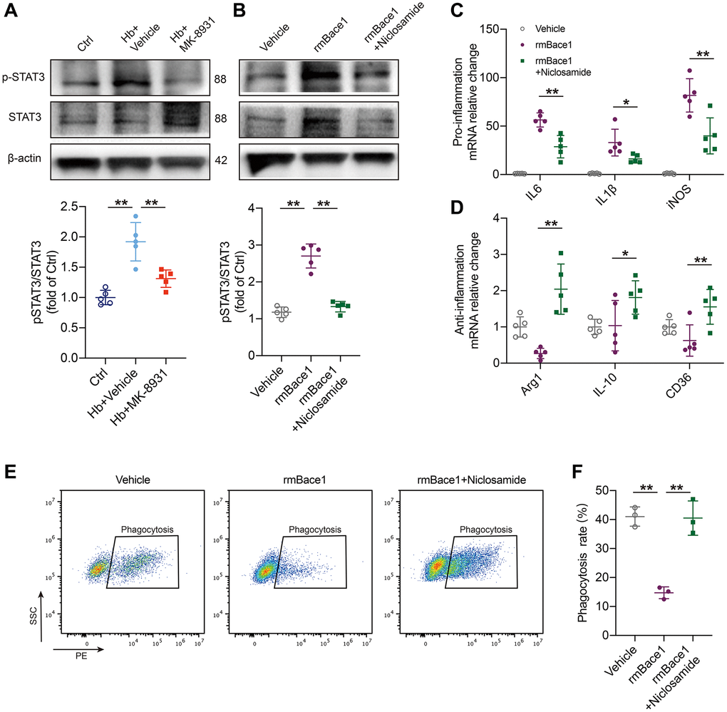 To explore the mechanisms by which BACE-1 inhibits the beneficial phenotype of microglia, we noted that STAT3 was closely associated with the microglial polarization shift and microglia-dependent regulation of neuroinflammation and phagocytosis in stroke [13, 22]. In addition, STAT3 was reported to be regulated by BACE1. We assessed the expression levels of STAT3 and phosphorylated STAT3 in the in vitro ICH model after MK-8931 and vehicle treatment and found that Hb stimulation significantly promoted STAT3 phosphorylation, whereas MK-8931 treatment significantly reduced this alteration (Figure 5A). We therefore treated PMG with recombinant mouse BACE1 protein (rmBACE1) and/or the STAT3-specific inhibitor niclosamide. The results showed that BACE1 significantly promotes STAT3 phosphorylation, while this effect is blocked by niclosamide (Figure 5B). We further determined the role of STAT3 in PMG function. We indeed observed that BACE1 promoted the expression of a high level of proinflammatory genes in the PMG and that treatment with niclosamide effectively reduced the level of proinflammatory factor genes (IL-6, IL-1β, iNOS). In addition, niclosamide significantly upregulated the expression of anti-inflammatory (Arg-1, IL-10) and pro-phagocytic genes (CD36) (Figure 5C, 5D). Flow cytometry indicated that rmBACE1 strongly reduced the phagocytosis ratio of RBCs by PMG, but niclosamide treatment effectively reversed the inhibitory effect of rmBACE1 (Figure 5E, 5F). Finally, we overexpressed microglia STAT3 levels under MK-8931 treatment and the results showed that the regulation of both microglia inflammation and phagocytosis by MK-8931 was significantly blocked (Supplementary Figure 3A–3D). Thus, BACE1-mediated STAT3 activation modulates neuroinflammation and erythrophagocytosis of microglia.