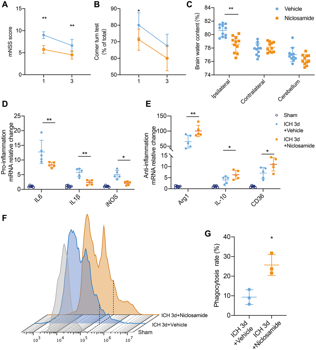 To investigate the effect of STAT3 inhibition on neurological function in ICH, we employed the corner turn test and mNSS score (Figure 6A). Administration of niclosamide resulted in improved neurological function and reduced brain water content at 1 day post ICH (Figure 6B, 6C). Similarly, the mNSS score also demonstrated that niclosamide significantly attenuated neurological impairments at both 1 and 3 days after ICH. We hypothesized that STAT3 inhibition would reduce BACE1-induced neuroinflammation by potentially impeding signal transduction activities. Specifically, microglia sorted from the mice with ICH 3 days after clonidine treatment showed a significant decrease in proinflammatory factor gene levels and a further increase in the expression of anti-inflammatory factor and pro-erythrophagocytosis molecule genes (Figure 6D, 6E). Finally, we used an in vivo RBC phagocytosis analysis system to determine the role of niclosamide in hematoma clearance. The results revealed that microglia of the mice with ICH 3 days under niclosamide treatment displayed a further elevated phagocytic ratio of involved erythrocytes (Figure 6F, 6G). In summary, inhibition of microglial STAT3 blocked the effect of BACE1 and had a positive effect on neuroprotection in ICH.