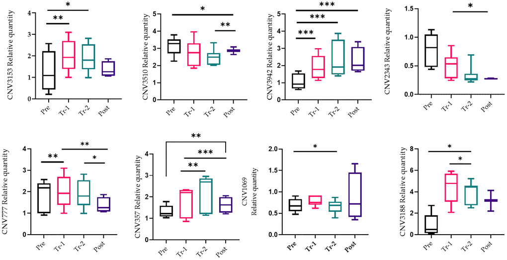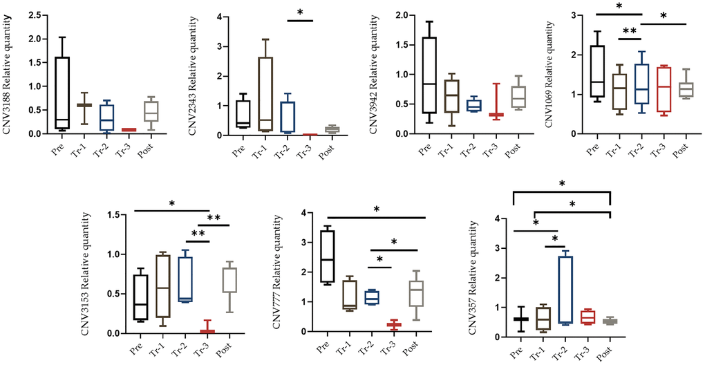 A sample of 517 individuals, were analyzed by Affymetrix (unpublished result). A list of candidate CNVs was generated from the Affymetrix microarray GeneChip® miRNA Array results. A list of candidate CNVs were selected to follow up in the pregnant mice model. Remarkably, chromosomes 2, 3, 5, 11, 16, and 17 contained more genes undergoing frequent copy number gain in humans, whereas a high frequency of copy number losses were observed on chromosomes 16 and 21. These human CNVs were aligned to the mouse CNV loci (via the UCSC LiftOver tool available at https://genome.ucsc.edu/cgi-bin/hgLiftOver) summarized in Table 1. Eight CNVs—six gained CNVs (CNV3942, CNV777, CNV357, CNV3153, CNV2343, and CNV1069) and two losses (CNV3188 and CNV3942)—and their corresponding gene expression were selected before, during and after the gestation period. These unique CNVs are mapped to one X-linked and seven autosomal sites as described below (Table1). Possible target genes were selected with copy number-associated changes in gene expression levels.