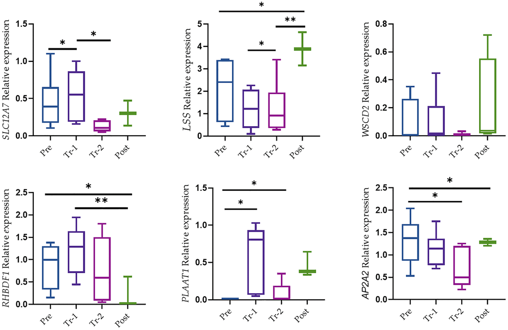 The WSCD2 gene has been found to be associated with insulin sensitivity [20]. The WSCD2 gene is involved in glucose metabolism in human islet cell expression studies and overlapped with CNV357 [21]. In addition, WSCD2 was found to interact with mtSNP in the mitochondrially-encoded NADH dehydrogenase 4 (MT-ND4) gene. Bushel et al. suggested that low expression of the WSCD2 gene coupled with large nuclei is associated with an increased risk of death and mortality [22]. However, WSCD2 has no known function and there is insufficient biological information to theorize a likely mechanism of how WSCD2 gene expression can play a role in the effect of nuclei size or how the mito-nuclear interaction contributes to the pathogenesis of breast cancer [23]. In our study, we found increased expression level which was not significant. Another significant CNV (CNV3942) associated with the LSS gene that encodes lanosterol synthase enzyme which converts (S)-2,3-oxidosqualene to lanosterol in the cholesterol biosynthesis pathway and which has the crucial function of the metabolic pathway in the homeostasis of hair growth and disruption of expression level caused congenital cataracts and skin lesions. It was also compelling that mutation in the LSS gene affects vitamin D metabolism and cholesterol metabolism. Our study demonstrated gradual decrease followed by an increase after labor. PLAAT1 belongs to the phospholipase A/acyltransferase (PLAAT) family and acts as Ca2+-independent NAT, overexpressed in skeletal muscle, the brain, and heart in both human and rodent. Pu et al. observed that PLAAT1 was found to create an immune-related prognostic model [24]. In our study, we found a decrease in PLAAT1 expression level that overlapped with CNV777 during trimester 2 followed by an increase in expression after labor, although this did not reach statistical significance.