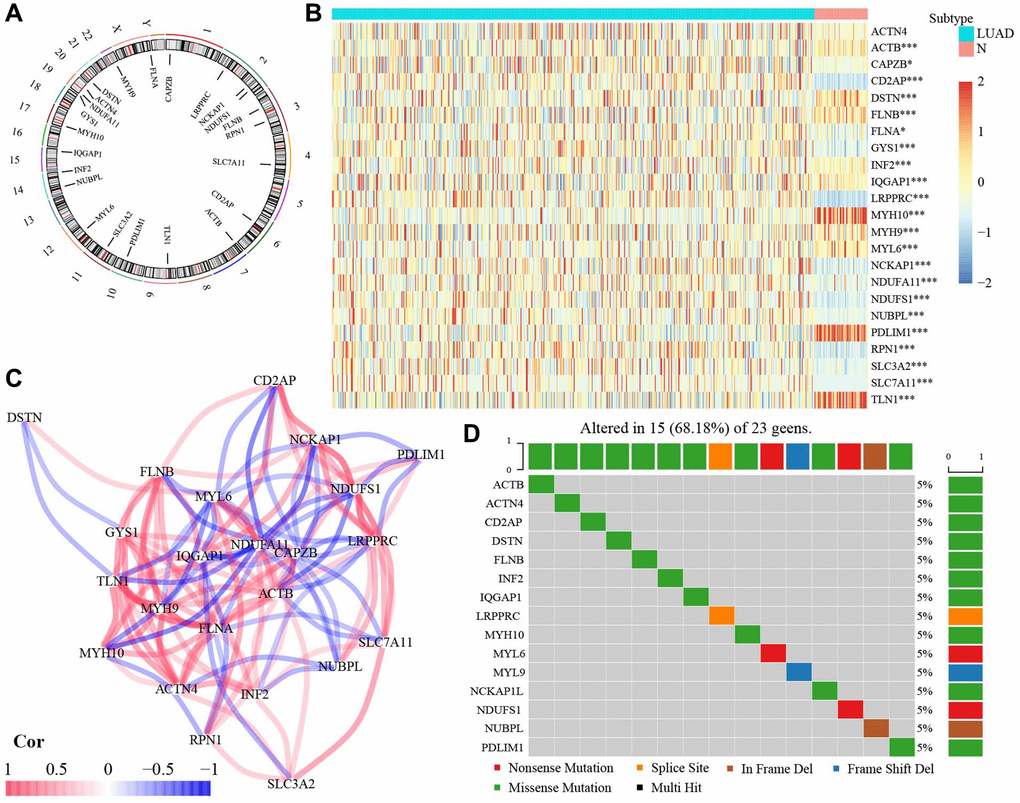 As shown in Figure 1A, among 23 DRGs, 3 DRGs (GYS1, NDUFA11, ACTN4) were located at Chromosome 20. In addition, 3 DRGs (LRPPRC, NCKAP1, NDUFS1) were situated at Chromosome 2. 2 DRGs (FLNB, RPN1) were found at Chromosome 3. 2 DRGs (NUBPL, INF2) were located at Chromosome 14. Others (CAPZB, SLC7A11, CD2AP, ACTB, TLN1, PDLIM1, SLC3A2, MYL6, IQGAP1, MYH10, DSTN, MYH9, FLNA) were located at Chromosome 4, 6, 7, 9, 10, 11, 12, 15, 17, 21, 22, and X, respectively. The Wilcoxon rank-sum test showed significantly different expressions in 22 DRGs, except for ACTN4, between normal and tumor tissues (Figure 1B). The correlation among 23 DRGs was presented in Figure 1C. Among 23 DRGs, 15 DRGs had gene mutation, although the mutation frequency for each DRGs was relatively low (Figure 1D).