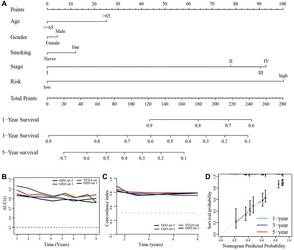 Using clinical characteristics (age, gender, smoking, TNM stage) and risk score, we develop a prognostic nomogram in TCGA set for predicting 1-, 3-, and 5-year OS of LUAD patients (Figure 10A). The AUCs and c-index in each set were more than 0.7 (Figure 10B, 10C). In addition, the calibration plot showed an optimally fit with the ideal model (Figure 10D).