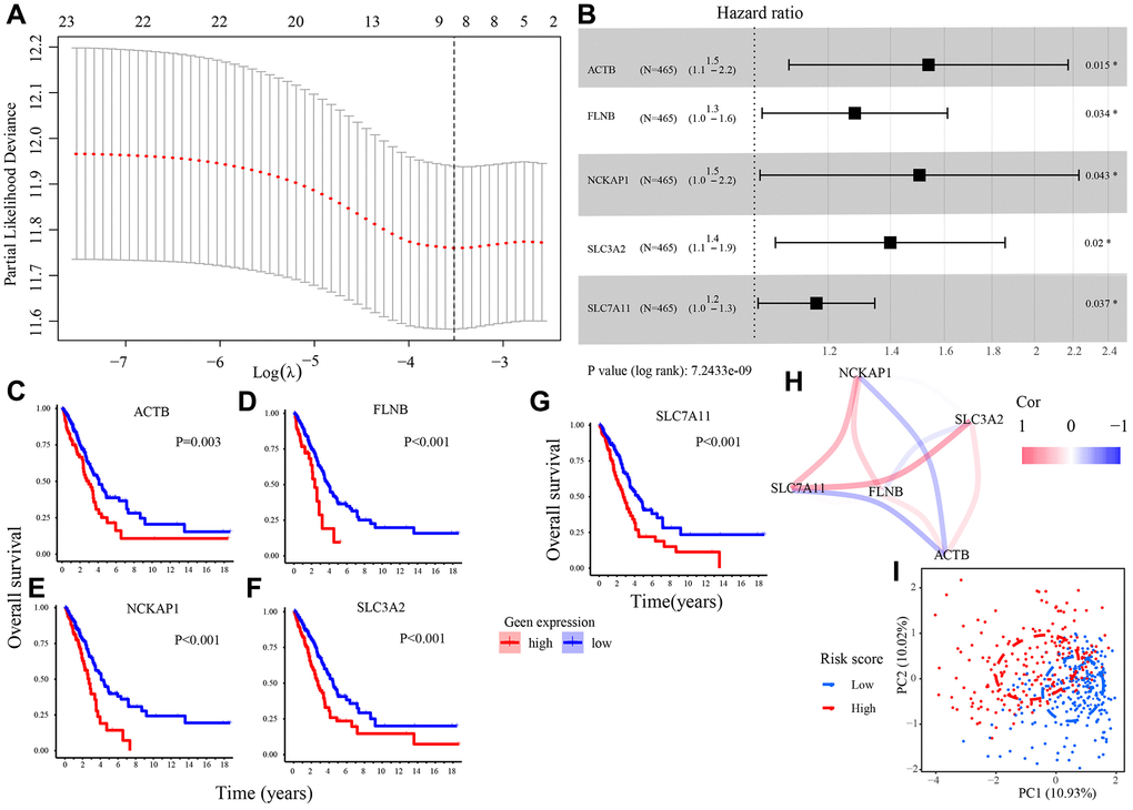 We utilized the least absolute shrinkage and selection operator (LASSO) regression (LASSO) analysis to analyze 23 DRGs and determined 8 DRGs highly related to the overall survival (OS) of LUAD patients in the TCGA set (Figure 2A). Then, those 8 DRGs were subjected to the multivariate Cox regression analysis. 5 candidate DRGs (ACTB, FLNB, NCKAP1, SLC3A2, SLC7A11) were screened out and used to build a prognostic model (Figure 2B) and a risk score formula to calculate the risk score of all patients. The risk score formula was presented as follows. The Kaplan–Meier plots demonstrated that all 5 DRGs were unfavorable factors for the clinical outcomes of LUAD patients (Figure 2C–2G). Figure 2H showed the correlation among 5 DRGs. According to the optimal cut-off risk score: 0.987, patients were divided into low- and high-risk groups. The principal component analysis (PCA) revealed that the samples in two risk groups were distributed in different areas (Figure 2I).