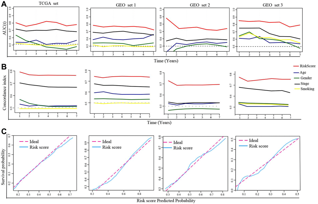 Next, we calculated the area under the curve (AUC) value and the c-index in each set to estimate the predictive accuracy of the DRGs model. The results showed the AUC values and c-index based on risk score in all sets were higher than that based on clinical indexes (age, gender, smoking, TNM stage), hinting that the DRGs model performed well in predicting clinical outcomes of LUAD patients (Figure 3A, 3B). In addition, the calibration plot in each set revealed that when the line angle is 45°, it represents the best prediction result, indicating that the DRGs model had a good predictive ability (Figure 3C).